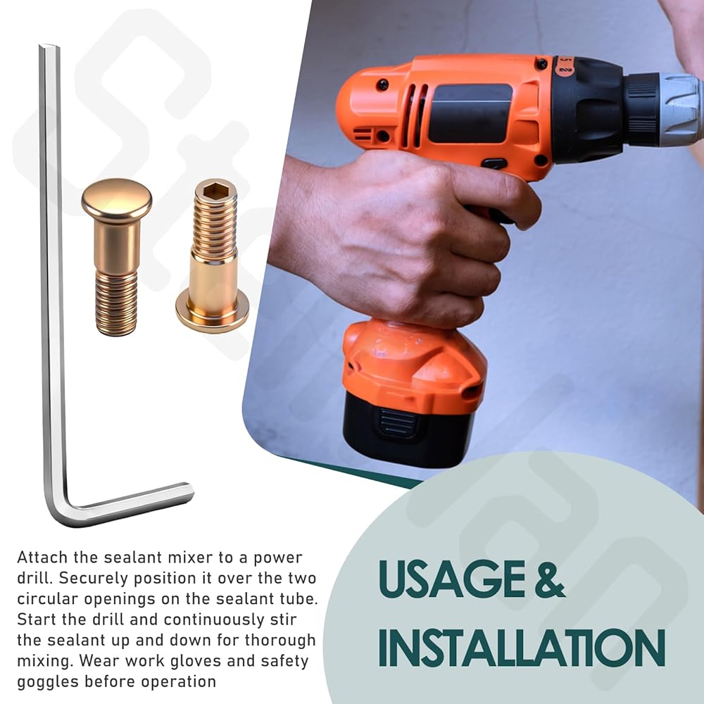 【Usage & Installation】: Attach the sealant mixer to a power drill. Securely position it over the two circular openings on the sealant tube. Start the drill and continuously stir the sealant up and down for thorough mixing. Wear work gloves and safety goggles before operation