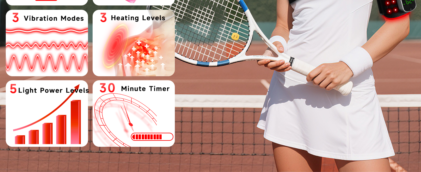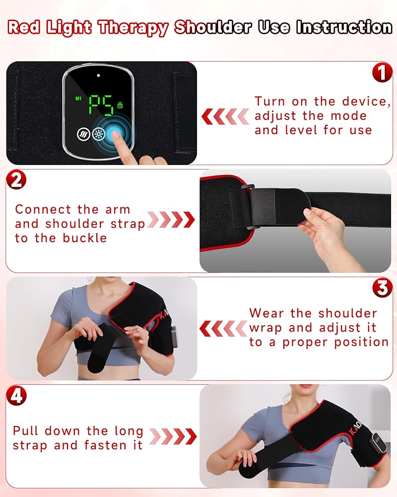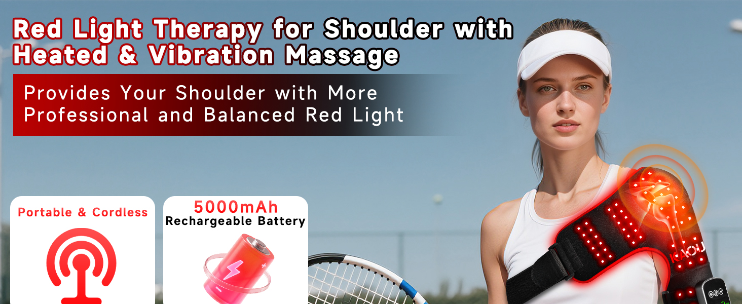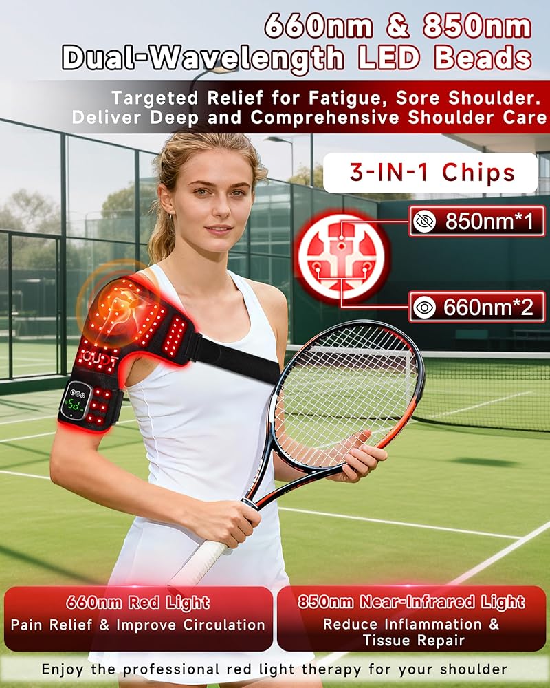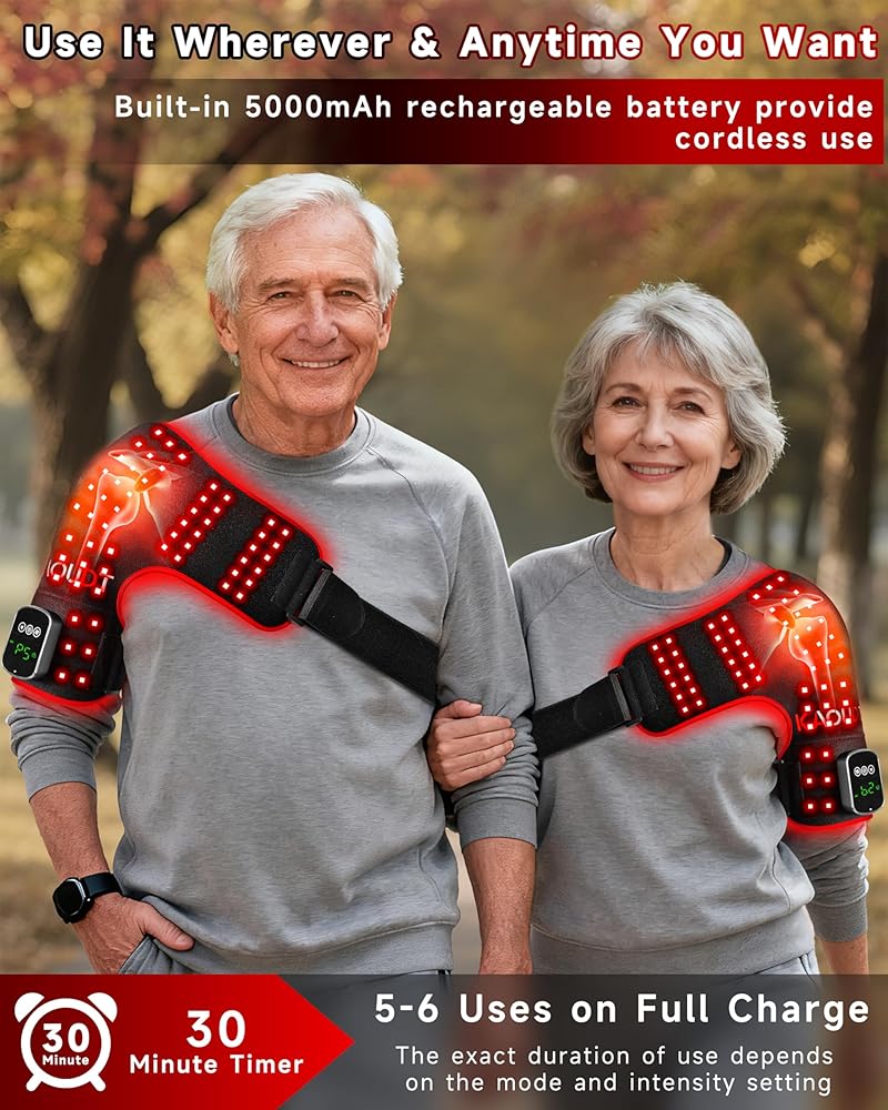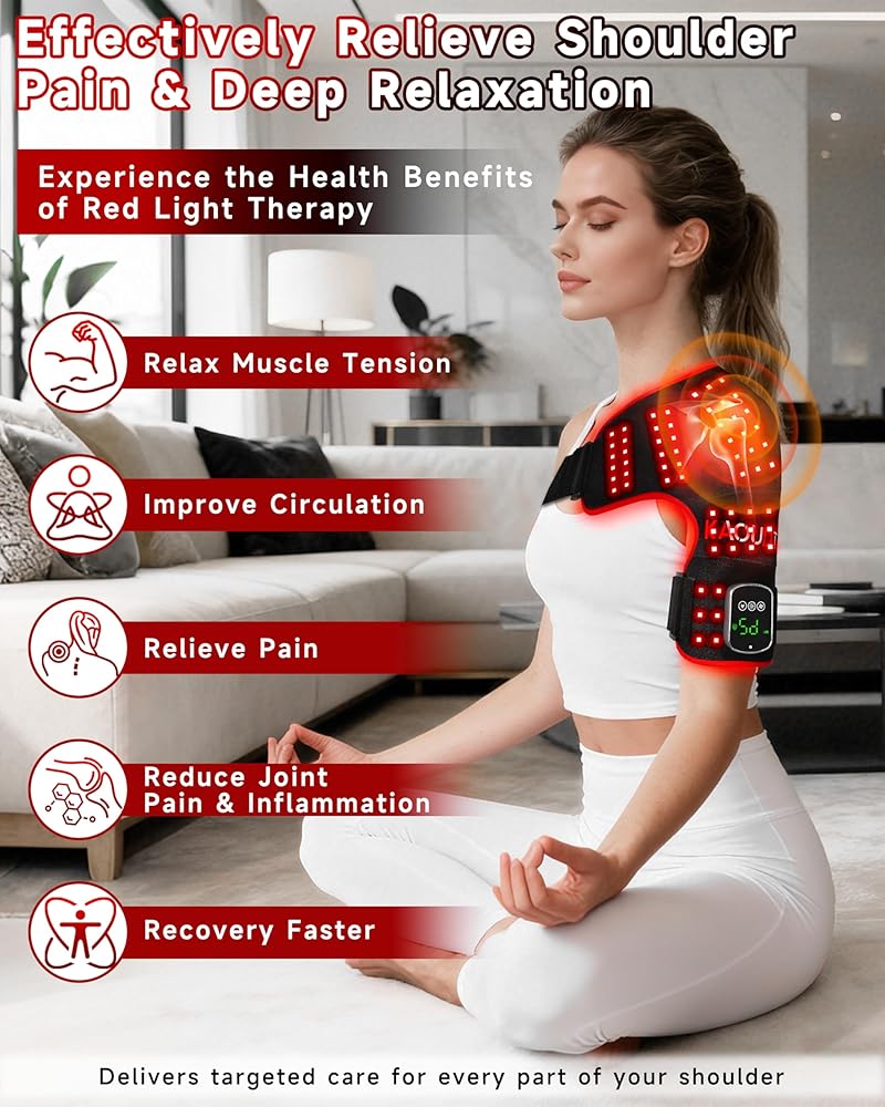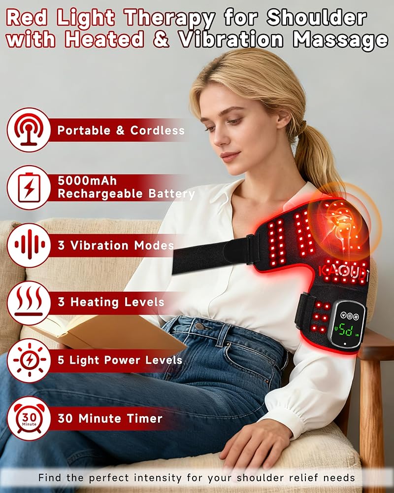 • 𝗥𝗲𝗱 𝗟𝗶𝗴𝗵𝘁 & 𝗩𝗶𝗯𝗿𝗮𝘁𝗶𝗼𝗻 𝗠𝗮𝘀𝘀𝗮𝗴𝗲 𝘄𝗶𝘁𝗵 𝗛𝗲𝗮𝘁𝗲𝗱 - لفافة كتف للعلاج بالضوء الأحمر مع اهتزازات وحرارة مهدئة. تتميز بـ 88 مصباح LED وكل حبة LED تجمع بين 2 × 660 نانومتر ضوء أحمر و1 × 850 نانومتر ضوء قريب من الأشعة تحت الحمراء للمساعدة في تهدئة آلام الكتف وتقليل ألم العضلات وتخفيف تصلب المفاصل وتعزيز الدورة الدموية.
