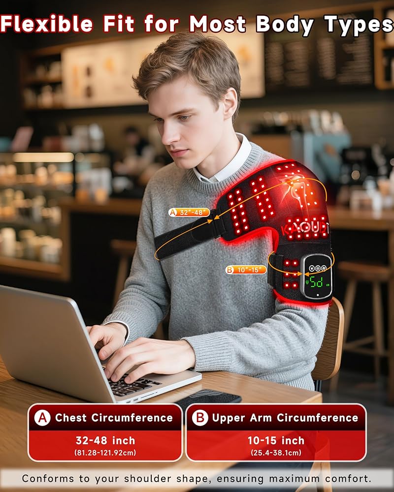 • 𝗔𝗱𝗷𝘂𝘀𝘁𝗮𝗯𝗹𝗲 𝗙𝗶𝘁 𝗳𝗼𝗿 𝗠𝗼𝘀𝘁 𝗕𝗼𝗱𝘆 𝗧𝘆𝗽𝗲𝘀 - يأتي جهاز علاج الكتف بالضوء الأحمر مزودًا بحزامين مرنين مرنين يناسب مقاسات الصدر من 32 إلى 48 بوصة والذراعين العلويين من 10 إلى 15 بوصة، ويناسب معظم أنواع الجسم. يضمن التفافًا مريحًا ومريحًا حول الكتف ولن ينزلق أثناء الاستخدام.