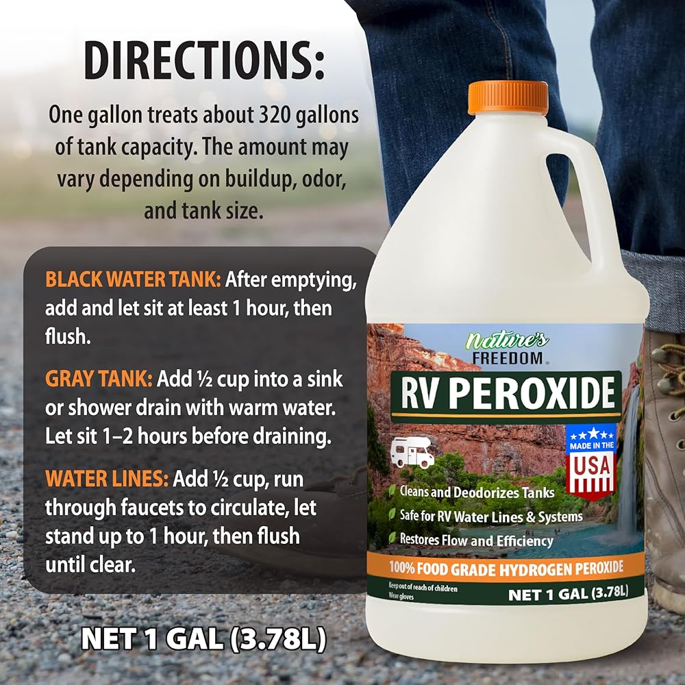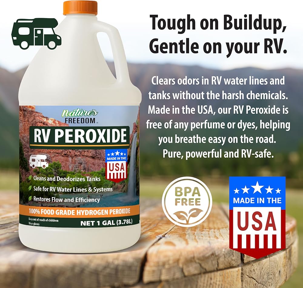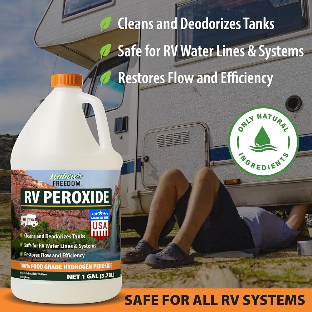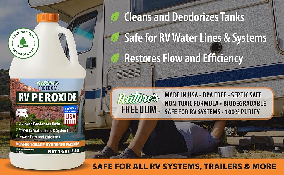 بيروكسيد الهيدروجين من Nature's Freedom RV، ينظف ويزيل الروائح الكريهة من خزانات RV الطازجة والرمادية والأسود، آمن لخطوط المياه والسباكة، ونقاء من الدرجة الغذائية، وقوة مركزة، 1 جالون