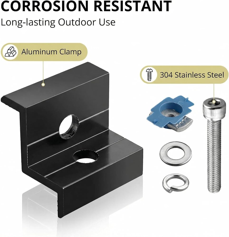 【 Durable & Corrosion-Resistant 】 - Made from high-quality aluminum alloy, these solar end clamps offer lightweight yet strong support with excellent corrosion resistance. Included 304 stainless steel nuts and bolts provide added rust protection for long-lasting outdoor performance.