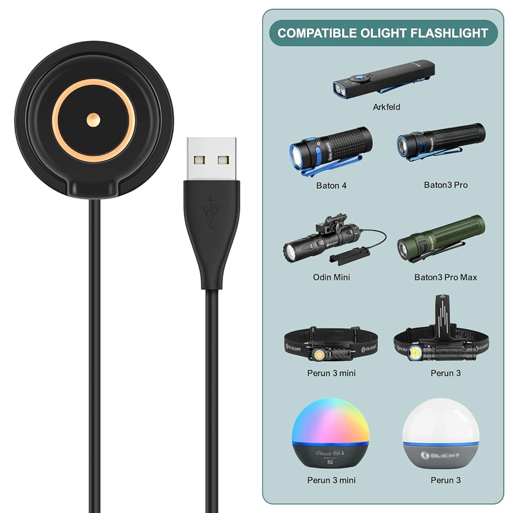 MCC 3 شاحن مغناطيسي 2 حزمة، كابل شحن مغناطيسي عالمي متوافق مع سلسلة Olight Odin/Warrior/Seeker/Baton/Perun/Arkfeld والمزيد - سلك شحن USB بديل لمصابيح Olight الكاشفة