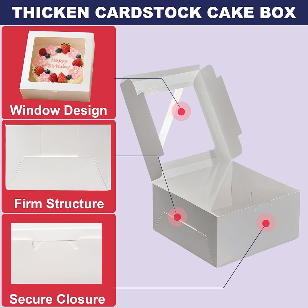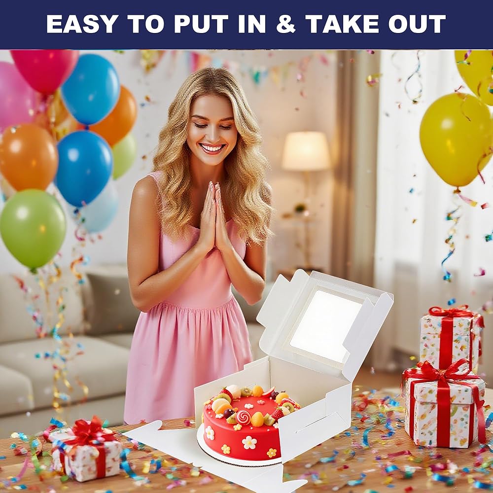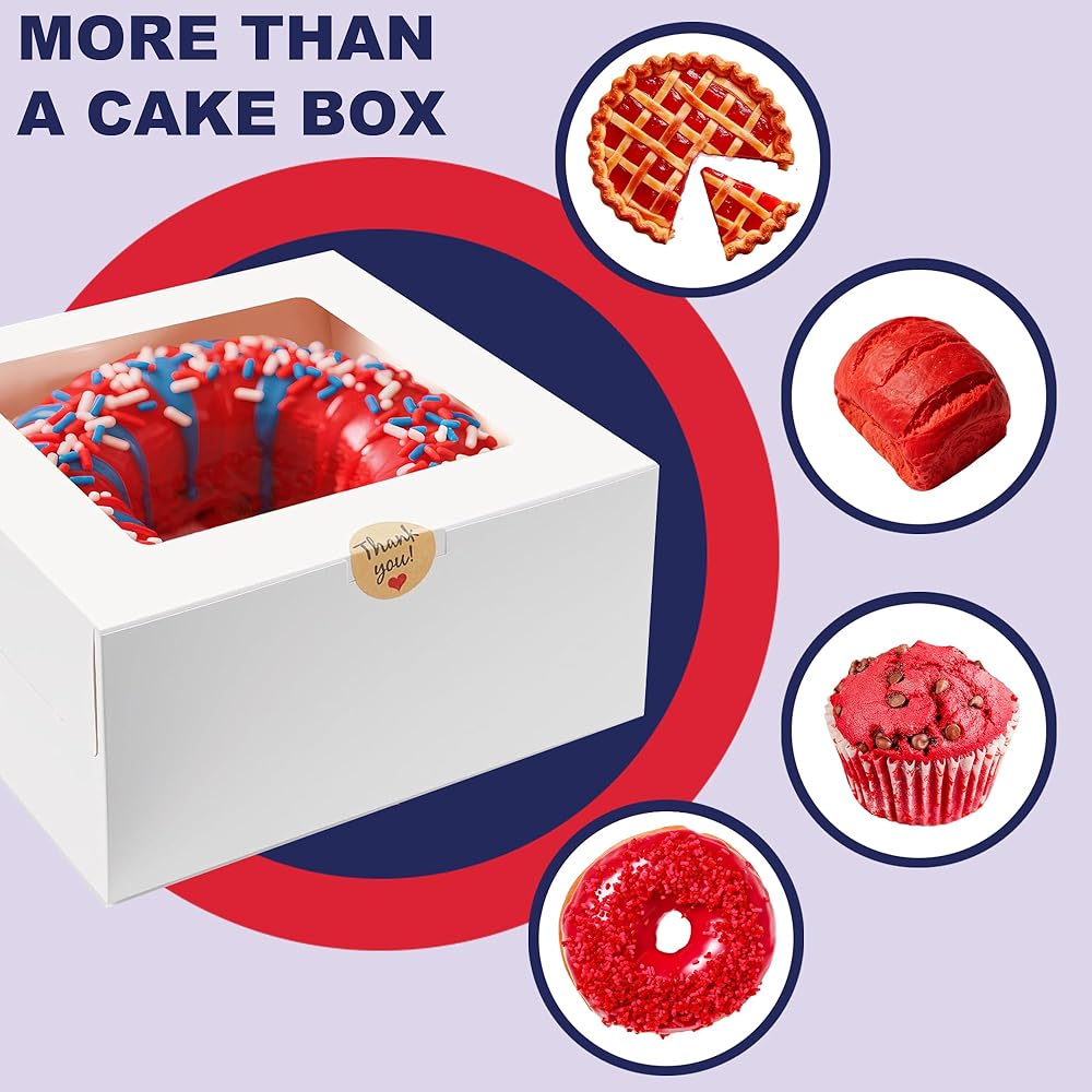 These 8x8x4 inch Cake Boxes are perfect for presenting baked goods. They are sturdy and hold up well, providing good protection for cake, cupcake, cookie, pie, chocolate, donut, cheesecake, and other treats., versatile for all kinds of big days, holiday, The clear windows allows you to display baked goods inside. These bakery boxes are a must-have for any baker or professional bakery. These cake boxes can be used as gift display, cake transport container, bakery packaging boxes and take-out boxes.Suitable for a variety of occasions such as wedding, birthday, party, Valentine's Day, Christmas and other celebrations.