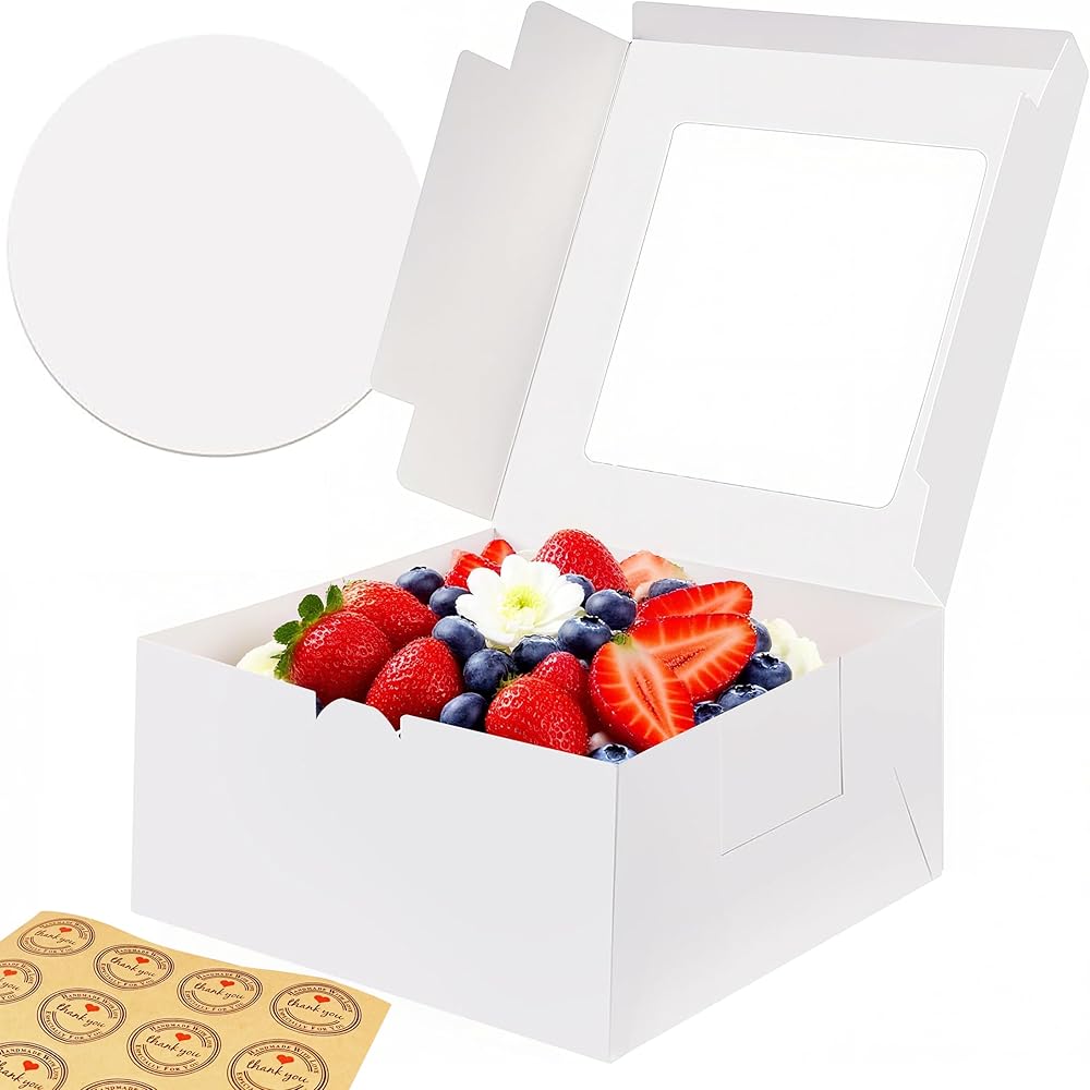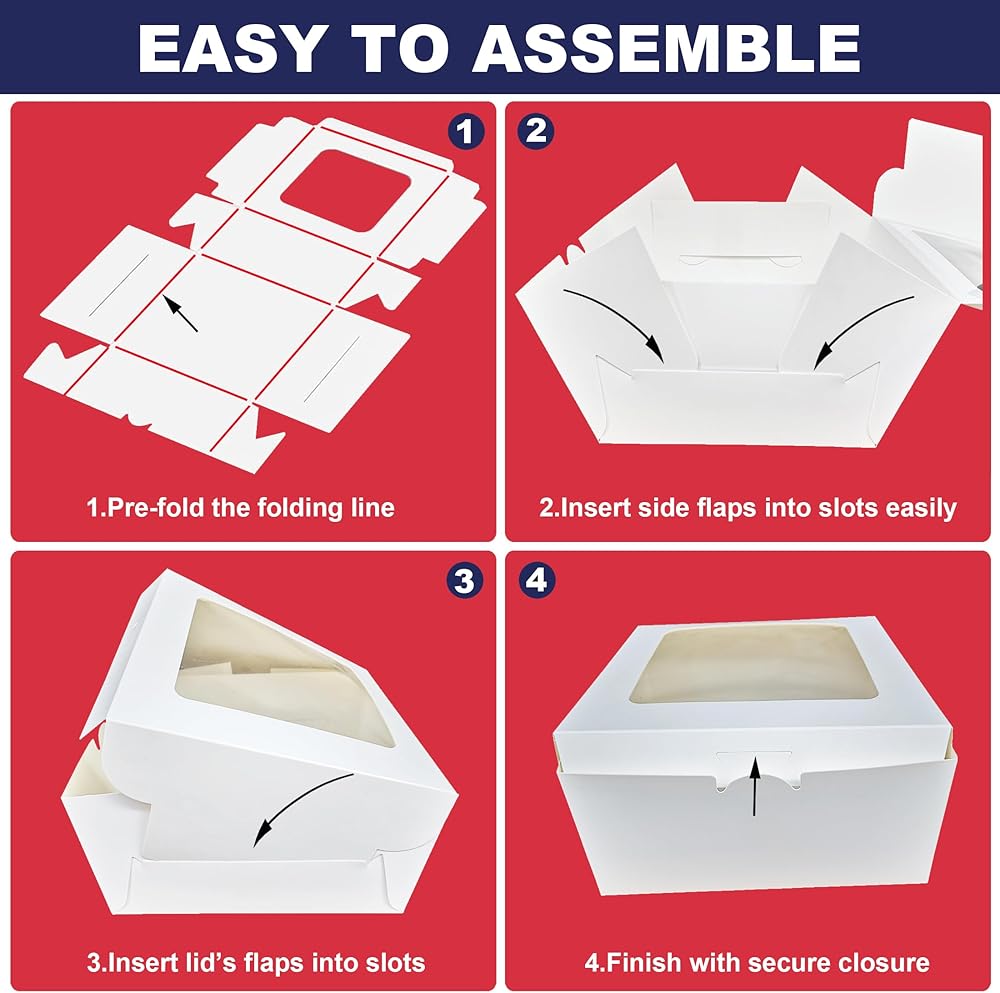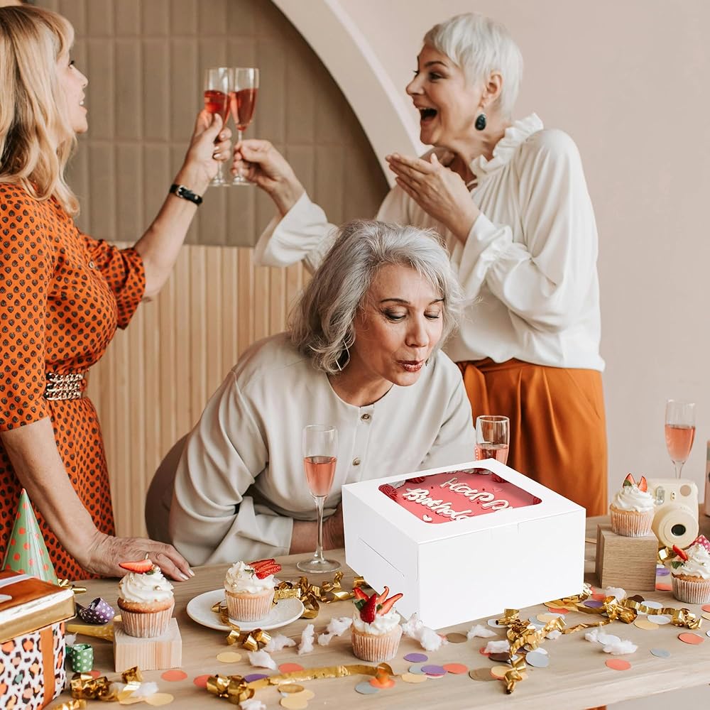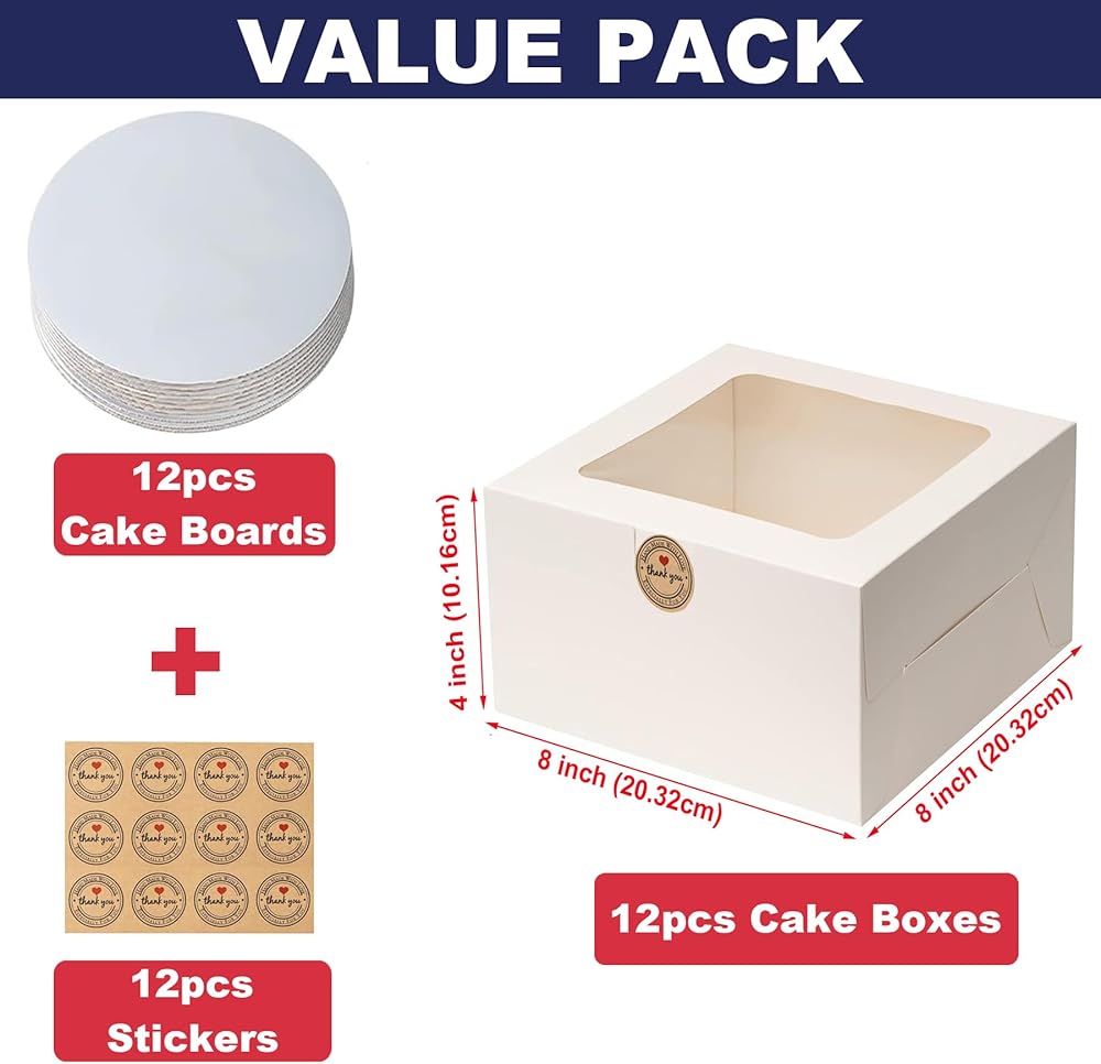 These 8x8x4 inch Cake Boxes are perfect for presenting baked goods. They are sturdy and hold up well, providing good protection for cake, cupcake, cookie, pie, chocolate, donut, cheesecake, and other treats., versatile for all kinds of big days, holiday, The clear windows allows you to display baked goods inside. These bakery boxes are a must-have for any baker or professional bakery. These cake boxes can be used as gift display, cake transport container, bakery packaging boxes and take-out boxes.Suitable for a variety of occasions such as wedding, birthday, party, Valentine's Day, Christmas and other celebrations.