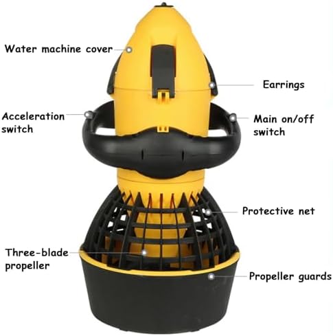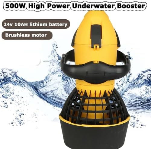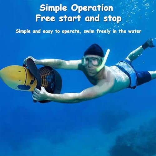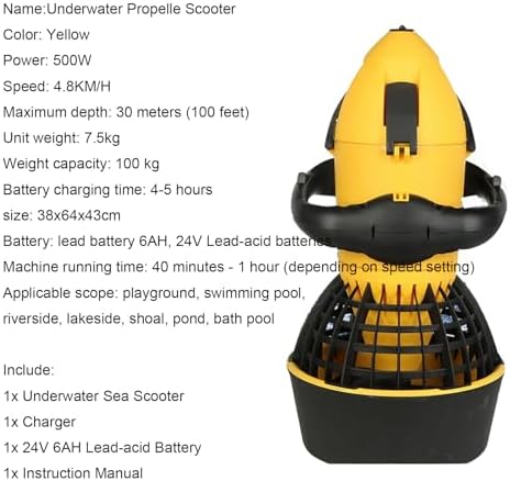Discover the thrill of underwater exploration with our Underwater Propelle Scooter, designed for water sports enthusiasts, snorkelers, and divers alike. This electric sea scooter features a powerful 500W brushless motor and a robust 24V 10AH lithium battery, providing exceptional performance and reliability on your aquatic adventures. Weighing only 6.5kg, this lightweight scooter can accommodate users up to 100kg, making it perfect for friends and family. With a maximum speed of 5.4KM/H and a runtime of 50 to 70 minutes, depending on your speed settings, you'll enjoy extended underwater excursions without the hassle of frequent recharges. The scooter can be fully charged in just 4 to 5 hours, ensuring you spend more time exploring and less time waiting. Designed for various environments, including swimming pools, lakesides, rivers, and even the ocean, our Underwater Propelle Scooter can reach depths of up to 20 meters (65 feet), allowing you to explore diverse underwater landscapes. Its vibrant yellow color ensures visibility, enhancing safety during your adventures. Using the scooter is intuitive and user-friendly. After entering the water, simply hold the operating handle with both hands, adjust the machine's position, and press the start switch to activate the propeller. As you glide through the water, you'll experience an exhilarating sense of freedom, whether you're diving deep or snorkeling among colorful marine life. Included in your purchase are the Underwater Sea Scooter, a charger, a 24V 10AH lithium battery, and an instruction manual for easy setup. Elevate your aquatic experience and make every swim memorable with this innovative underwater scooter. Dive into adventure and enjoy the underwater world like never before!