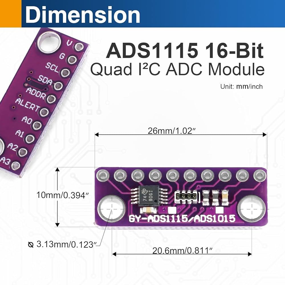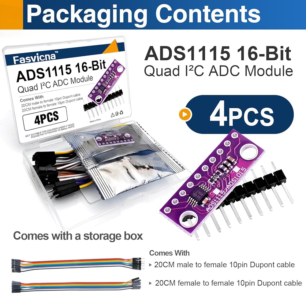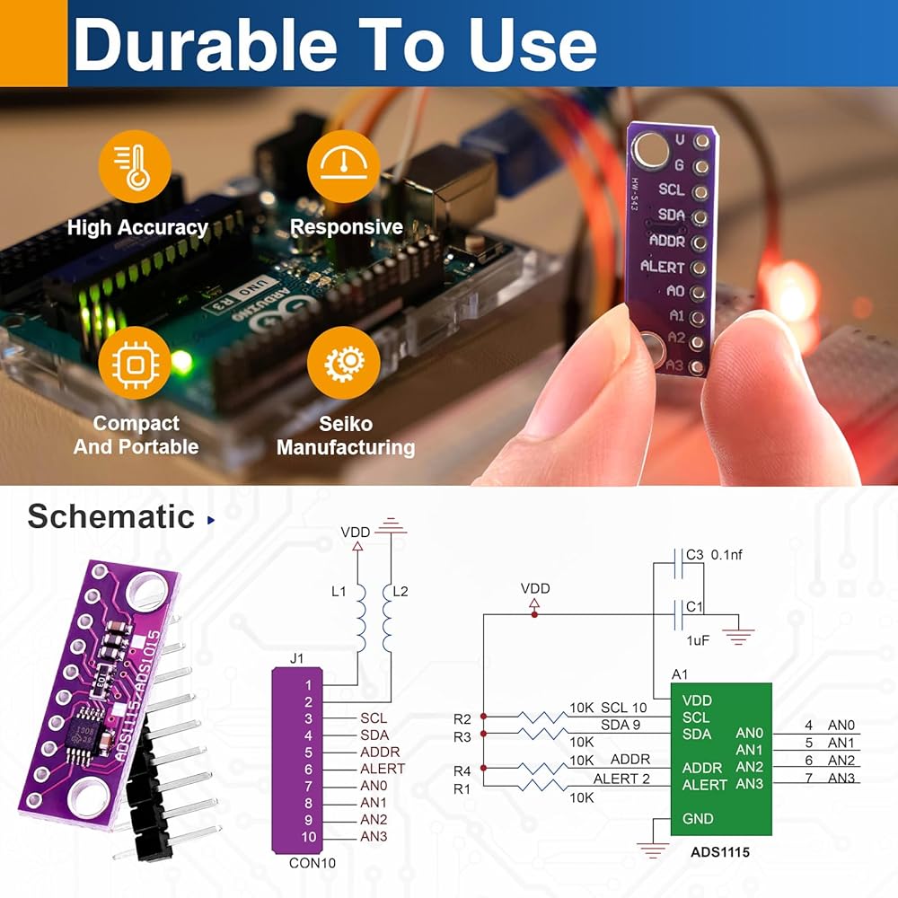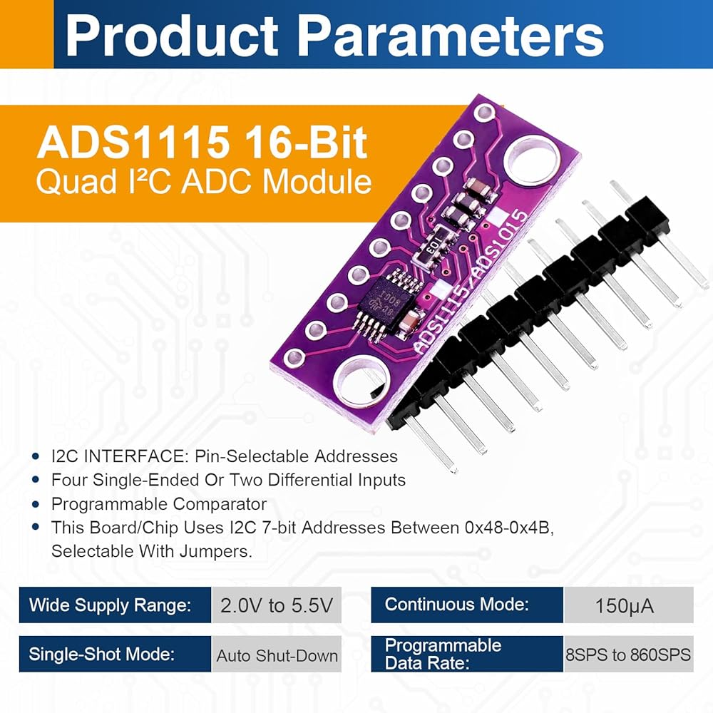 High Precision 16-Bit ADC Conversion: The ADS1115 ADC module provides high-resolution 16-bit analog-to-digital conversion, delivering accurate and stable readings for sensors, voltage measurement, and data acquisition projects.