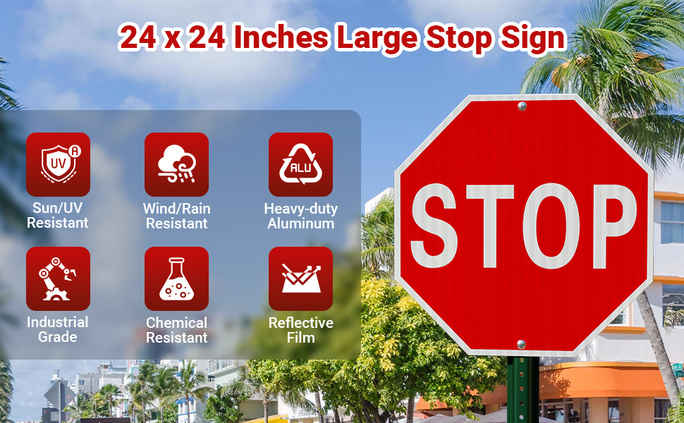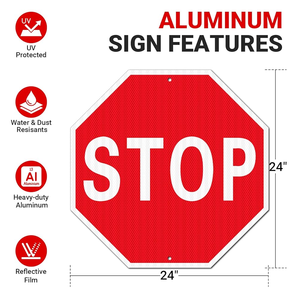 Easy To Install: Large stop sign measures 24 x 24 inches made of Heavy Duty Rust Free Aluminum, It comes with 2 pre-drilled mounting holes, easy to install.