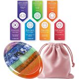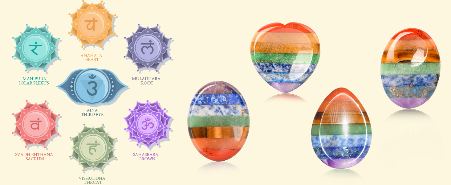 • يتضمن حجر الشاكرا السبعة من الأحجار الكريمة 7 أحجار طبيعية مميزة، كل منها يتماشى مع شاكرا محددة: اليشب الأحمر (الجذر)، الأفينتورين الأحمر (العجزي)، عين النمر (الضفيرة الشمسية)، الأفينتورين الأخضر (القلب)، حجر البقع الأزرق (الحلق)، اللازورد (العين الثالثة)، والجمشت (التاج).