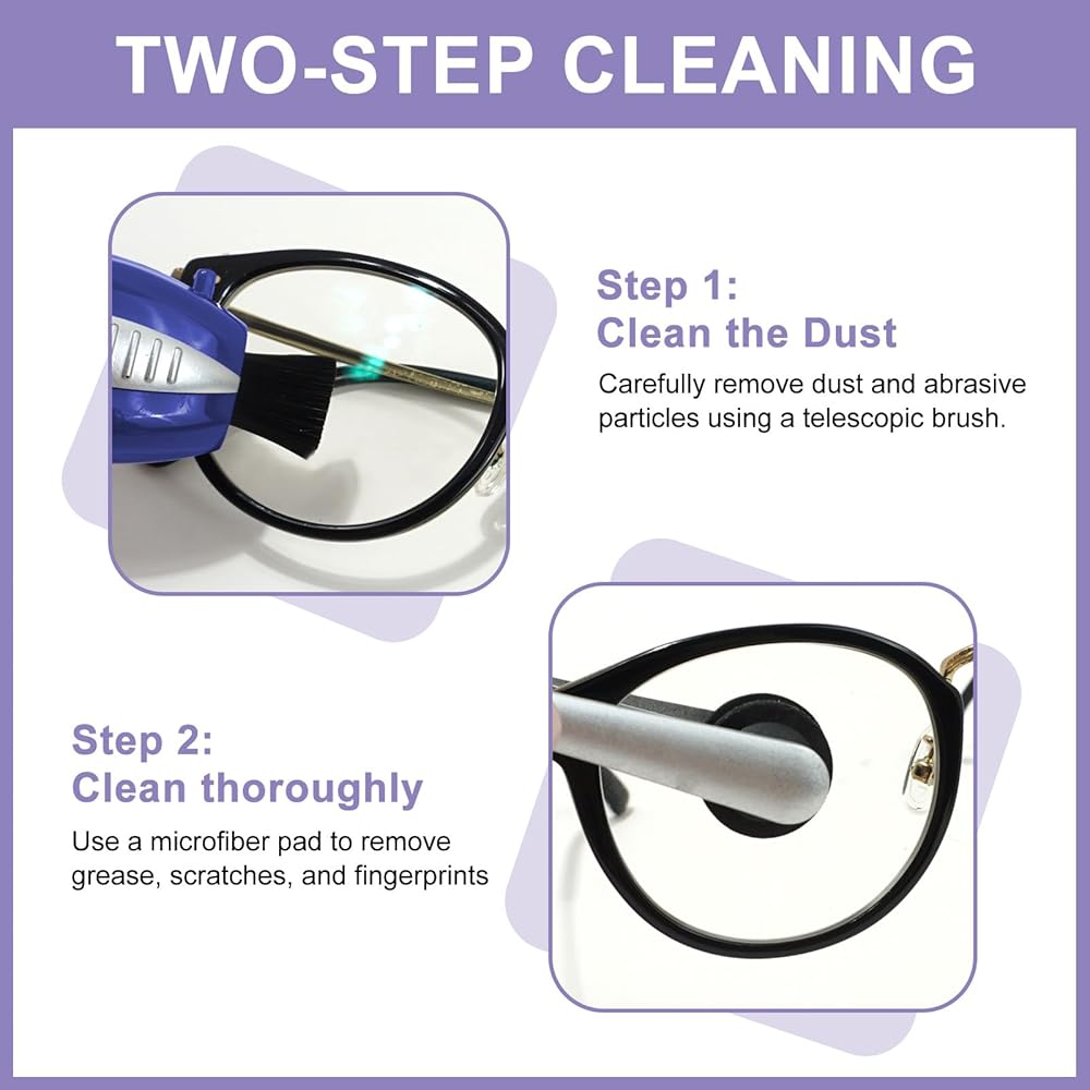 • Simple 2-Step Usage Process: First, use the retractable dust brush to wipe off dust, dirt, or dandruff on the lens. Then, use the microfiber cleaning pad to remove smudges—this process minimizes static, reduces dust attraction, and keeps lenses spotless, ensuring unobstructed vision in just two easy steps.
