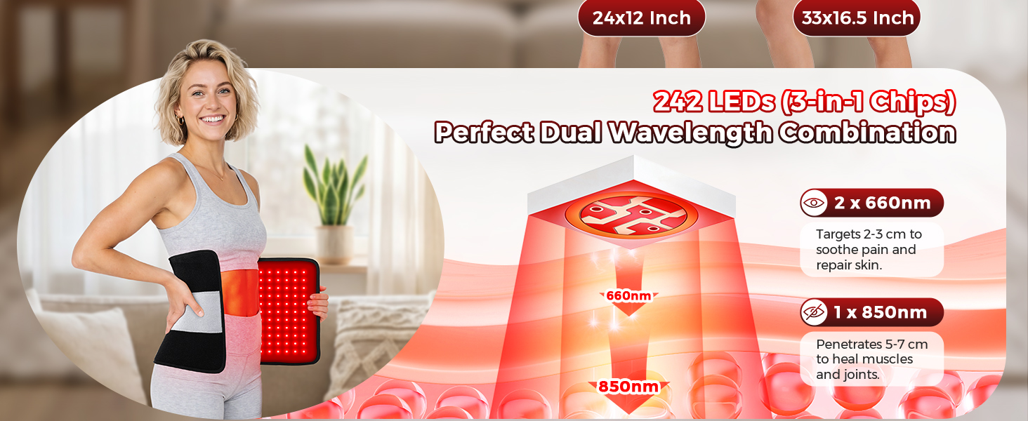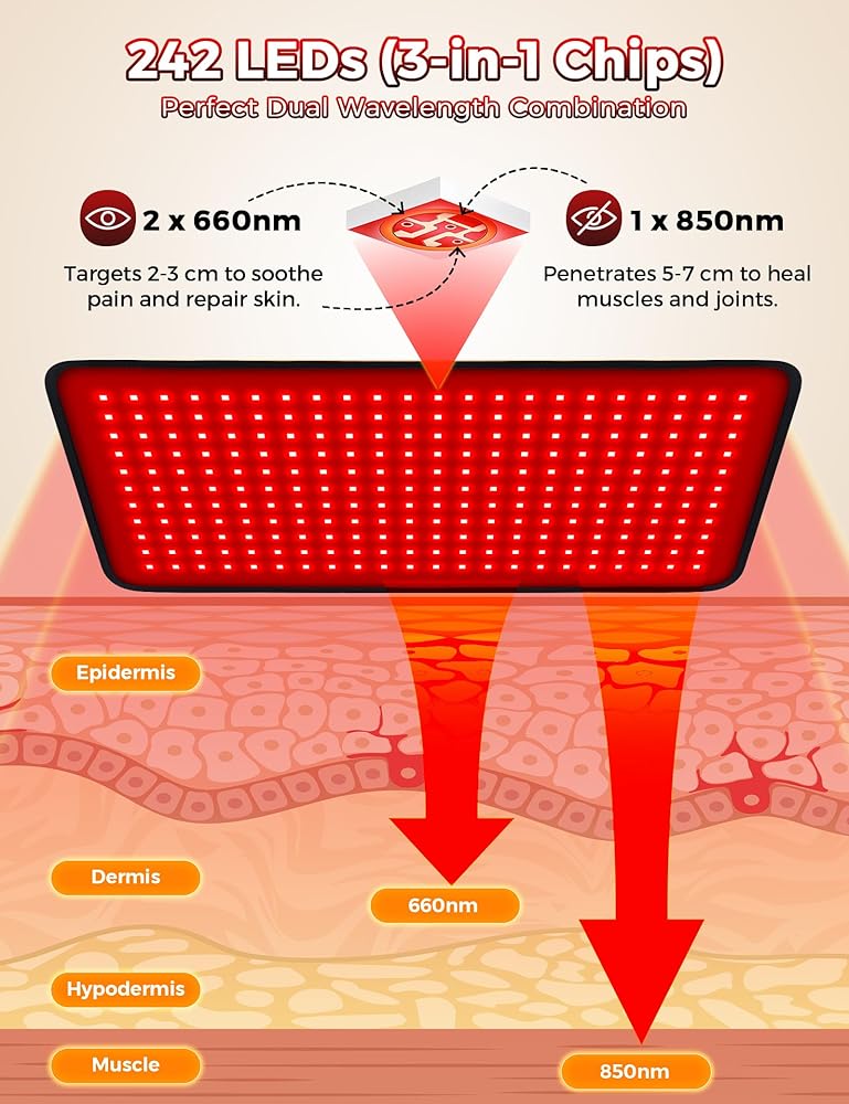 242 مصباح LED: تقنية LED 3 في 1 بأطوال موجية مزدوجة لعلاج طبيعي آمن وغير جراحي. يستهدف الضوء 660 نانومتر أعماق 2-3 سم لتخفيف الألم وإصلاح الجلد، بينما يخترق الطول الموجي 850 نانومتر عمق 5-7 سم لتعزيز تعافي العضلات والمفاصل والاسترخاء.