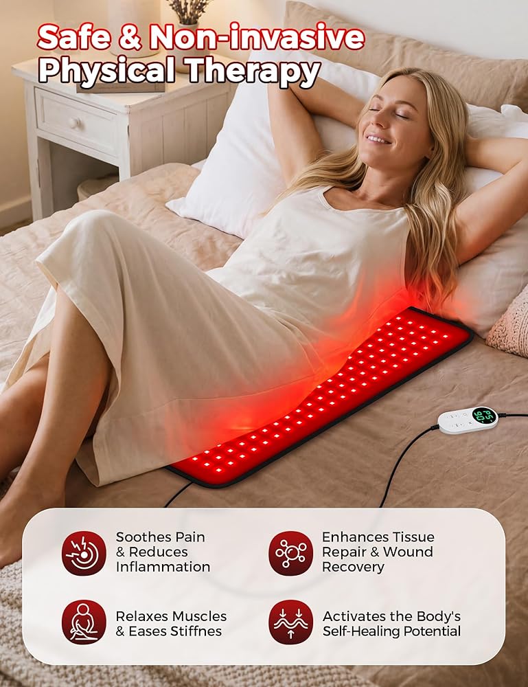 وسادة علاج مقاس 60.96 × 30.48 سم: للخصر والظهر والكتفين والركبتين. يشتمل على أشرطة للاستخدام بدون استخدام اليدين وتعديل الزاوية بسهولة. يتميز بسطح مطاطي صناعي بدرجة علاجية لتعزيز توزيع الضوء الأحمر بشكل متساوٍ، وصديق للبشرة وسهل التنظيف.