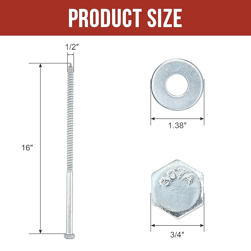 مسامير متخلفة 1/2 بوصة × 16 بوصة (12 قطعة) مسامير متخلفة 1/2 بوصة للخشب، رأس سداسي عالي التحمل مع غسالات، مطلي بالزنك