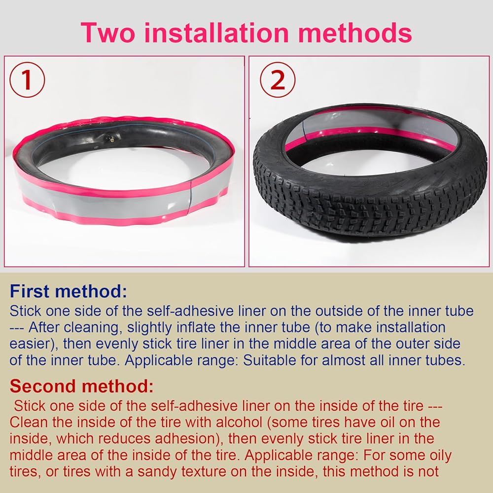 • طريقة التثبيت السهلة: ميزة اللصق الذاتي تجعل التثبيت أمرًا سهلاً، طريقتان للتركيب. الطريقة الأولى: بعد تنظيف الجزء الداخلي من الإطار، انزع الغشاء الخلفي وألصق شريط الإطار الواقي داخل الإطار، واضغط عليه في مكانه. الطريقة الثانية: نظف الجزء الخارجي من الأنبوب الداخلي، ثم نفخه قليلاً، وألصق شريط الحماية على الجزء الخارجي من الأنبوب الداخلي، واضغط عليه في مكانه، ثم ضعه في الإطار الخارجي.