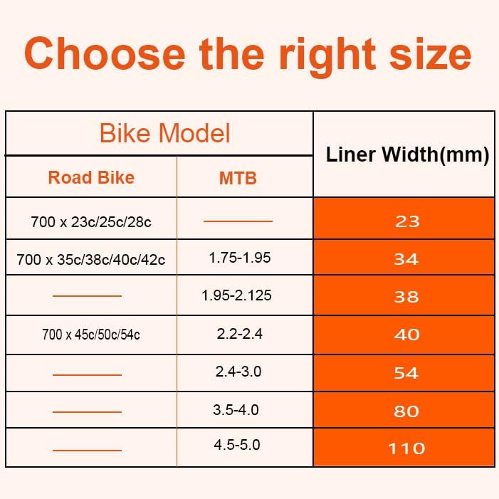 • نصيحة: عند اختيار بطانة إطار الأنبوب الداخلي للدراجة، راجع مواصفات الإطار (عرض الإطار)، لأنها لا تتعلق مباشرة بحجم العجلة. بالنسبة لدراجات الطرق: 700c x23/700c x25/700c x28، اختر بطانة إطار بعرض 23 مم؛ بالنسبة لمعظم الإطارات: 34 مم مناسب للإطارات بعرض 1.75 بوصة - 1.95 بوصة أو 700c x 35/38/40/42c، 38 مم للإطارات بعرض 1.95 بوصة - 2.125 بوصة، أو 40 مم للإطارات بعرض 2.2 بوصة - 2.3 بوصة - 2.4 بوصة أو 700c x 45/50/54c؛ للإطارات الدهنية: 54 مم مناسب للإطارات بعرض 2.4 بوصة - 3.0 بوصة، و80 مم للإطارات بعرض 3.5 بوصة - 4.0 بوصة، و110 مم للإطارات بعرض 4.5 بوصة - 5.0 بوصة.