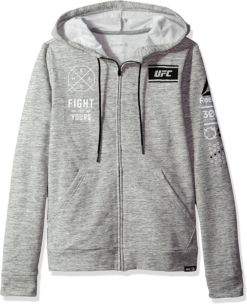 Be bold and make a proud, supporting statement in the UFC full zip hood. This officially licensed fleece zip up features prominent UFC graphics on a soft blended hoodie. This pullover will have you fight night ready or a great pullover to wear after a serious training session.