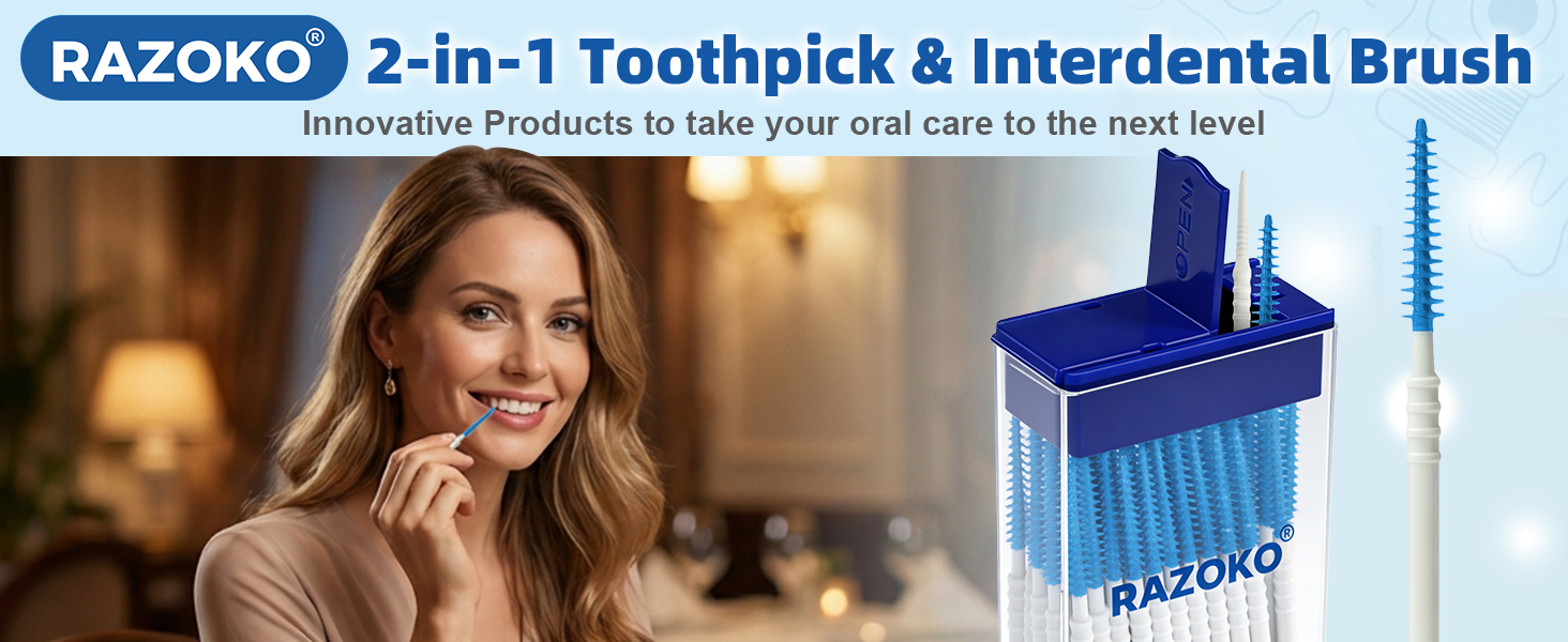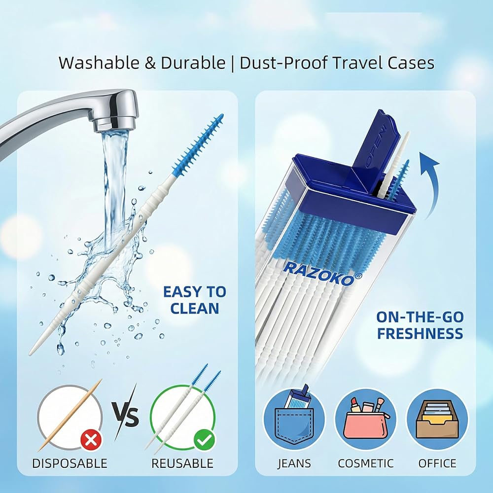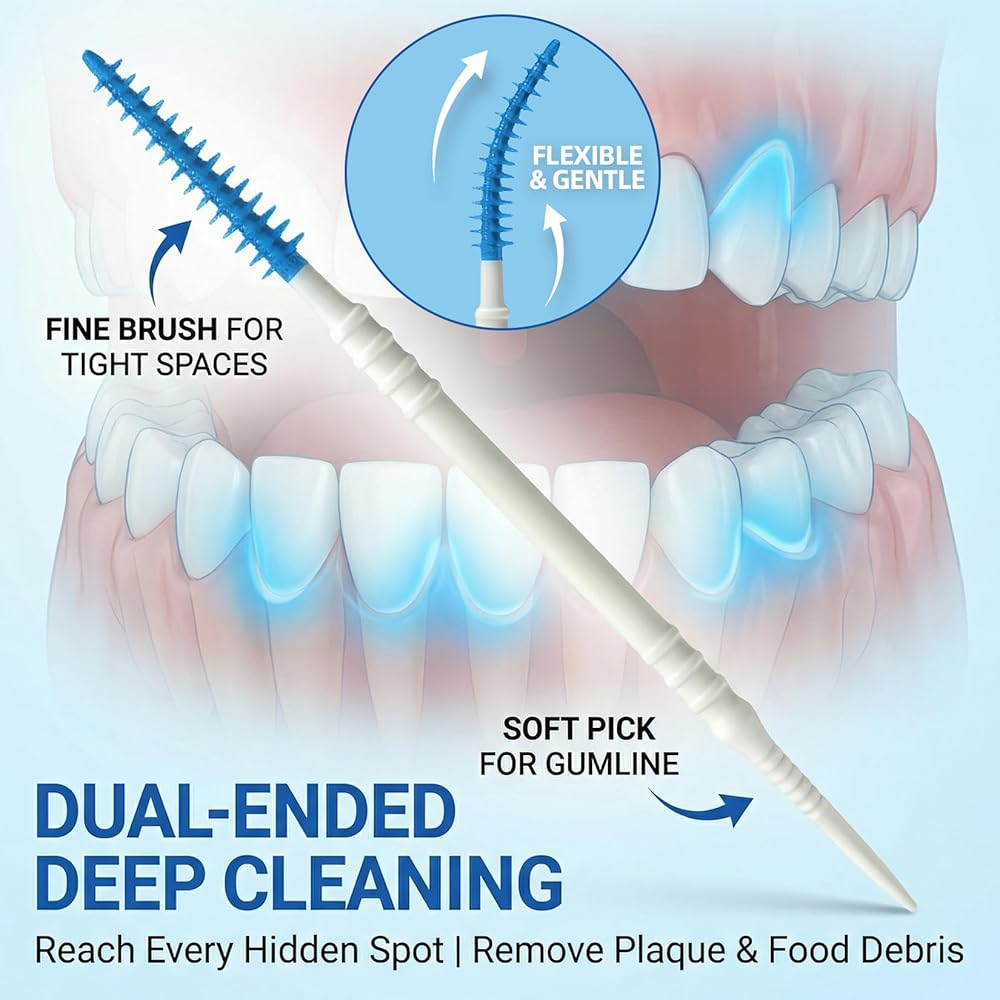 حل تنظيف مزدوج 2 في 1: تجمع فرشنا بين الأسنان بين طرفين وظيفيين: أحدهما بشعيرات سيليكون ناعمة (لإزالة الترسبات اللطيفة وبقايا الطعام بين الأسنان) وأداة تنظيف أسنان مزخرفة (للتنظيف في الفجوات الضيقة). هذا التصميم 2 في 1 يجعله أداة أسنان متعددة الاستخدامات للعناية بالفم الشاملة.
