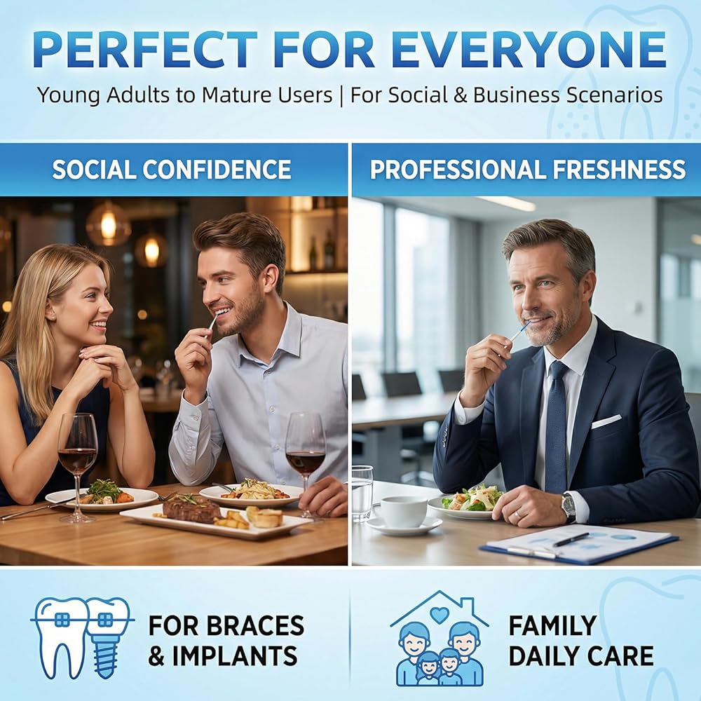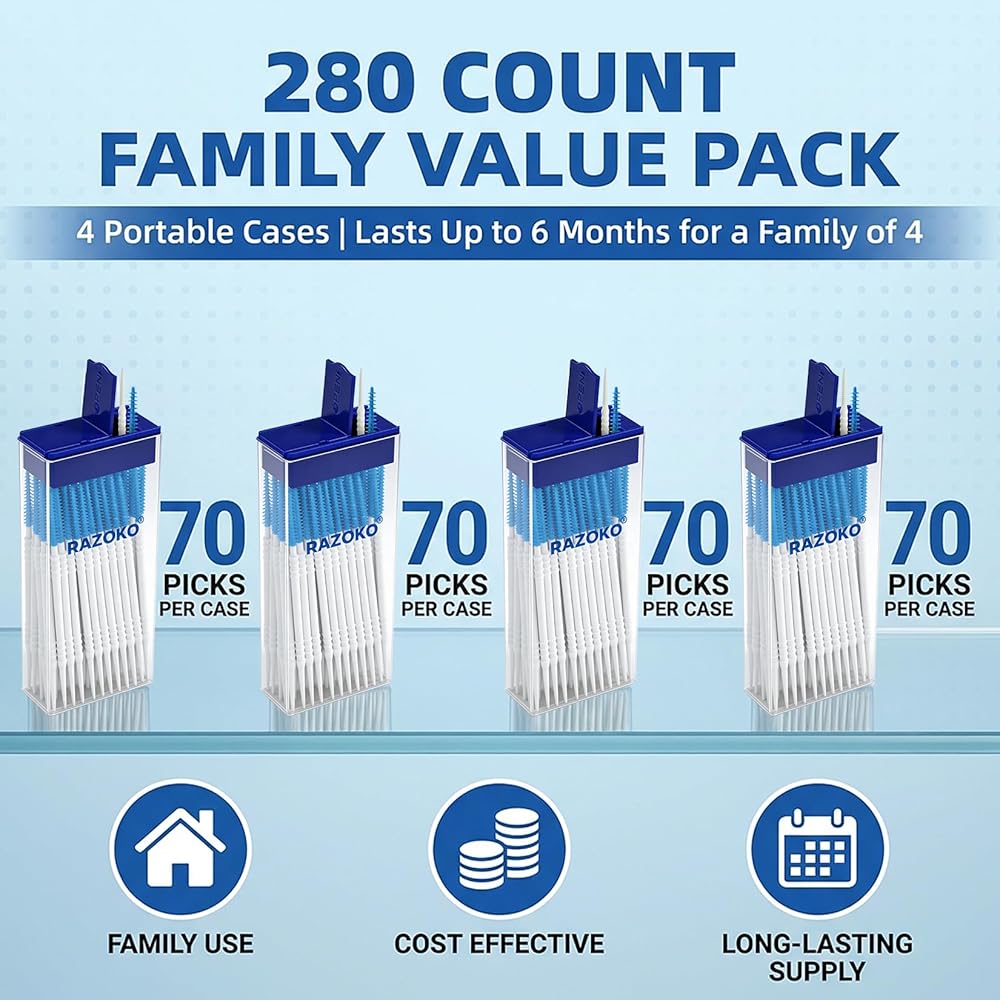 4 عبوات (280 إجماليًا) للاستخدام طويل الأمد: تحتوي هذه المجموعة على 4 عبوات (إجمالي 280 اختيارًا بين الأسنان) لتلبية احتياجات العناية بالفم على المدى الطويل - مثالية للاستخدام العائلي أو الروتين اليومي أو التخزين. الكمية الكبيرة التي تحتوي على 280 قطعة تعني أنك لن تنفد بسرعة، مما يوفر قيمة كبيرة للعناية بالأسنان بشكل متسق في المنزل أو أثناء التنقل.