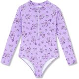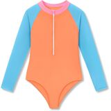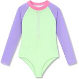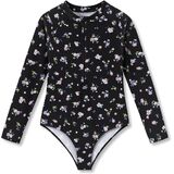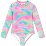 Crafted with little girls' comfort, safety, and style in mind, this Dvenki one-piece rashguard swimsuit combines sun protection, flexible movement, and adorable digital prints for all-day summer fun. The high neck design offers extra coverage and sun safety, while the soft raglan sleeve construction allows unrestricted arm movement for swimming, playing, and beach activities. Featuring a convenient front zipper for easy on and off, smooth stretch fabric that retains its shape, and a triangle bottom for a secure, comfortable fit, this swimsuit is available in a variety of charming patterns: pink-blue tie-dye, purple floral, purple-yellow-green-pink color block, blue-orange-pink color block, and black floral. Each design uses clear, vibrant digital printing, making it perfect for the pool, beach, vacation, and summer water adventures. Available in sizes 6X–16 to fit growing girls.