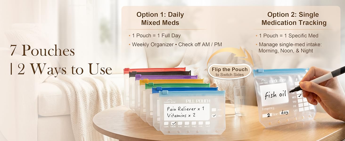 【Unique Dual-Sided Recording System】Our 7 day pill organizer features 7 color-coded pouches with a smart tracking design. One side is printed with "Medication" to record single drug details, while the "Pill Pouch" side tracks mixed regimens. This allows you to customize it as a daily pill organizer or weekly pill organizer according to your specific health needs, far more flexible than a standard pill container.