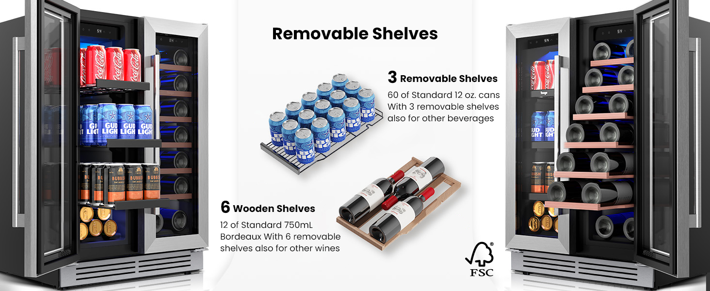 • 【تخزين مرن وحماية مثالية】يمكنها حمل 20 زجاجة بسعة 750 مل بوردو و60 علبة من العلب القياسية سعة 12oz مرة واحدة. يحتوي قسم النبيذ على 6 أرفف خشبية، بينما يحتوي قسم المشروبات على 3 أرفف سلكية. الرفوف الخشبية مصنوعة من الخشب، مصدرها الغابات المستدامة. تعمل هذه الأرفف الناعمة على تقليل الاحتكاك والاهتزاز. كلا الرفوف قابلة للإزالة والتعديل، مما يسمح لك بتخصيص التصميم الداخلي ليناسب أحجام مختلفة من زجاجات النبيذ والمشروبات.