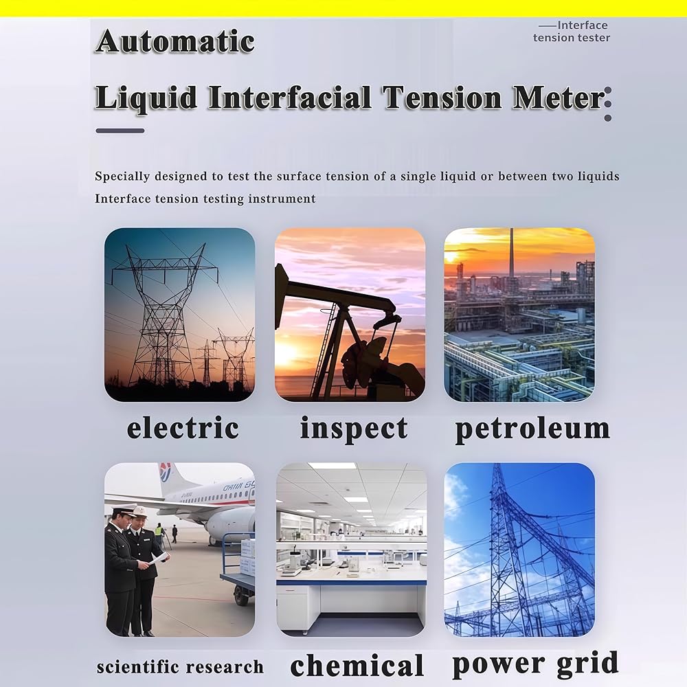 Automatic interfacial tension meter Application field 1) Oil aging test, especially transformer oil (ASTM D-971) 2) Determination of Surfactant Effectiveness in Wetting Agents and Cleaners Test Surfactant Solution Concentration. 3) Canning approval and cleaning validation in the food industry. 4) Interfacial tension measurements for quality control and optimization of emulsifiers. 5) Cooling lubricant surface tension test