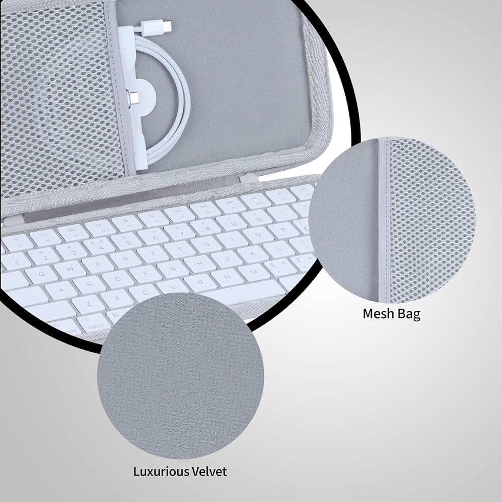 • الجزء الداخلي من الحافظة: تعمل البطانة الداخلية الناعمة والفخمة لجراب Peyyargo على حماية لوحة مفاتيح Apple السحرية الخاصة بك ضد الصدمات والصدمات والخدوش. تعمل هذه البطانة أيضًا كحاجز للغبار، مما يمنع تراكم الجزيئات على لوحة مفاتيح Apple Magic mac الخاصة بك. تم تصميم الحجرة الرئيسية لتحتضن لوحة المفاتيح اللاسلكية السحرية الخاصة بك بشكل آمن، بينما الجزء العلوي بالداخل مجهز بحقيبة شبكية يمكنها حمل الملحقات مثل كابلات البيانات وكابلات الشحن