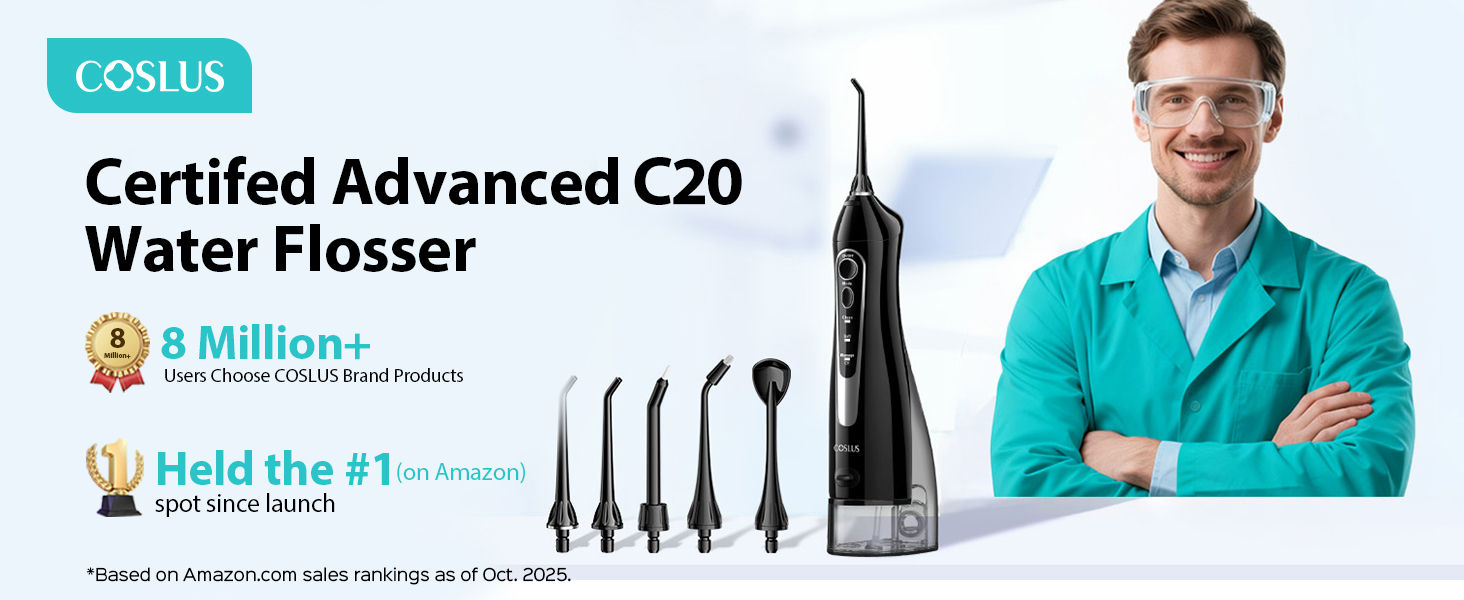ينظف خيط تنظيف الأسنان المائي بشكل فعال من أجل فم أكثر صحة: يتميز جهاز تنظيف الأسنان المائي COSLUS C20 بتقنية نبض الماء ثنائية الخيط المتقدمة والآمنة والفعالة 0.3 مم + 0.3 مم، والتي تم تطويرها وتحسينها باستمرار بواسطة فريق البحث لدينا على مدار سنوات من البحث واختبار المستخدم الحقيقي. توفر أداة تنظيف الأسنان المائية هذه 1400-1800 نبضة عالية الضغط في الدقيقة لاستهداف وإزالة البلاك من أجل تنظيف شامل. يتميز جهاز تنظيف الأسنان المائي هذا أيضًا بأوضاع تشغيل متعددة وإعدادات ضغط متعددة لتناسب ظروف الفم والمستخدمين المختلفين