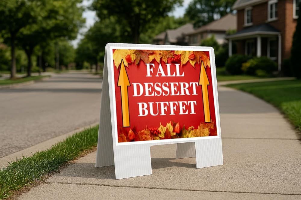 Fall Dessert Buffet Autumn Frame Colorful Maple Leaves On Red Background Directional Arrows A-Frame Double Sided 23x23 in. sign in Kuwait