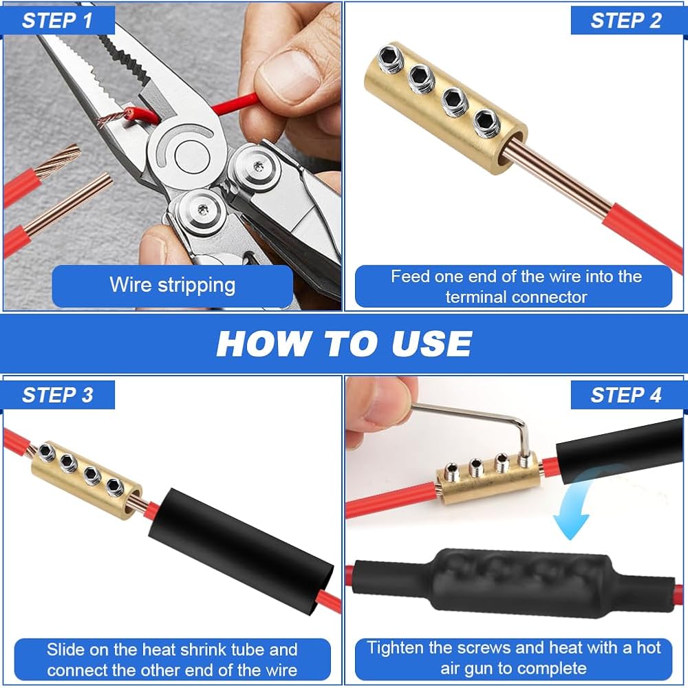 【Complete & Waterproof Connection Kit】This all-in-one package includes everything you need: 10 x 4-pole brass connectors, 40 x M3 stainless steel screws, 10 x waterproof heat shrink tubes, and 1 x wrench. It's the ultimate kit for creating durable, waterproof wire splices.