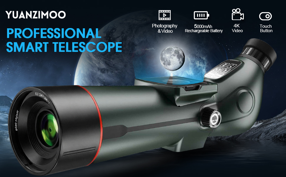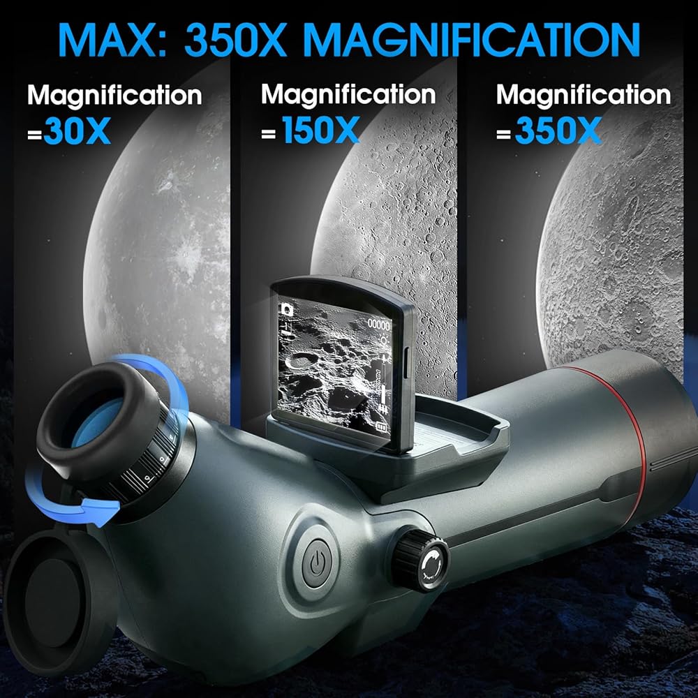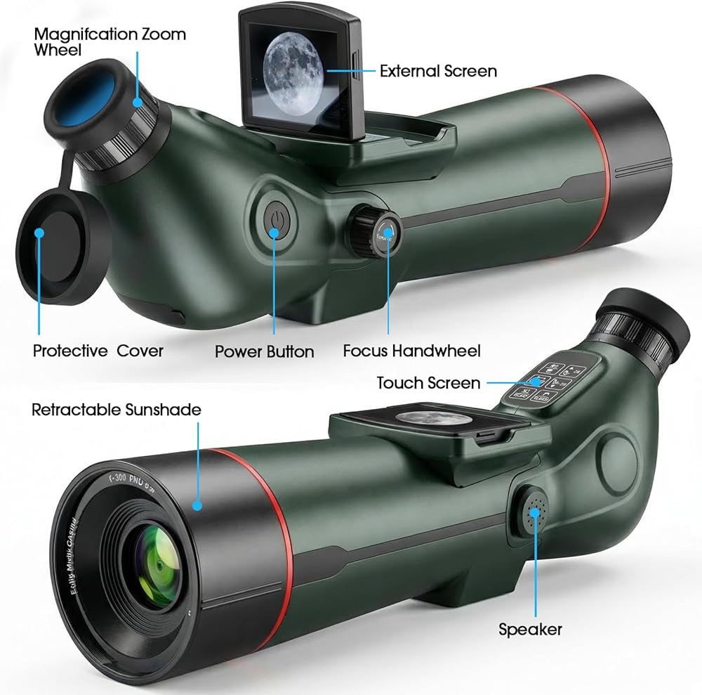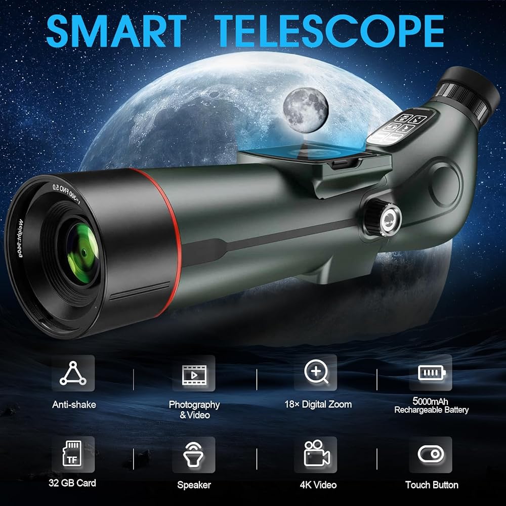 أداء بصري استثنائي لمشاهد واضحة تمامًا: يتميز بفتحة قوية مقاس 80 مم وطول بؤري 300 مم (f/8.89)، مقترنًا بمستشعر درجة ضوء النجوم الذي يدعم التكبير حتى 350x. يقدم صورًا مذهلة بدقة 4K عالية الدقة، حتى في ظروف الإضاءة المنخفضة أو أثناء مراقبة القمر