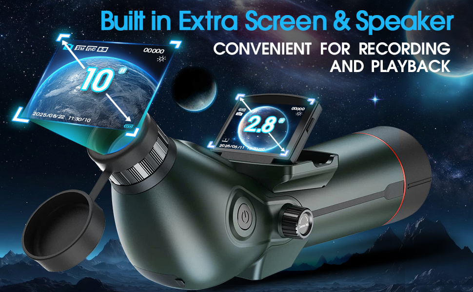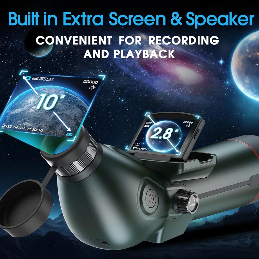 شاشة عرض مزدوجة للعرض المرن: تشتمل على عدسة عينية مع تعويض ديوبتر قابل للتعديل (±4) وشاشة خارجية قابلة للطي للعرض في الوقت الفعلي. تضمن مظلة الشمس المدمجة رؤية واضحة حتى في ضوء النهار الساطع، مما يوفر تجربة مراقبة سلسة وبديهية