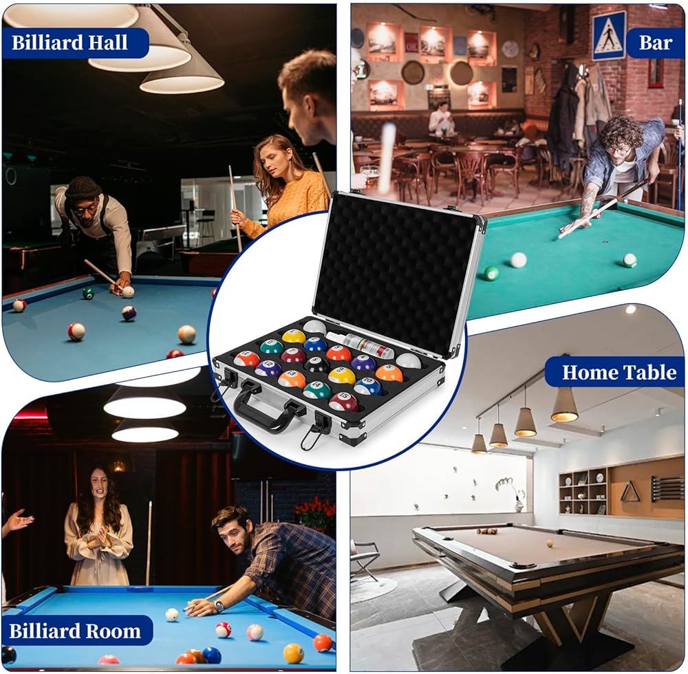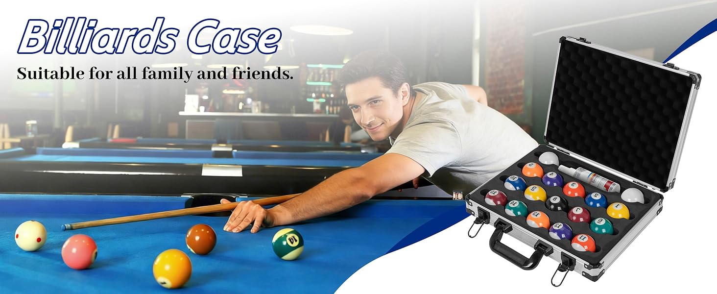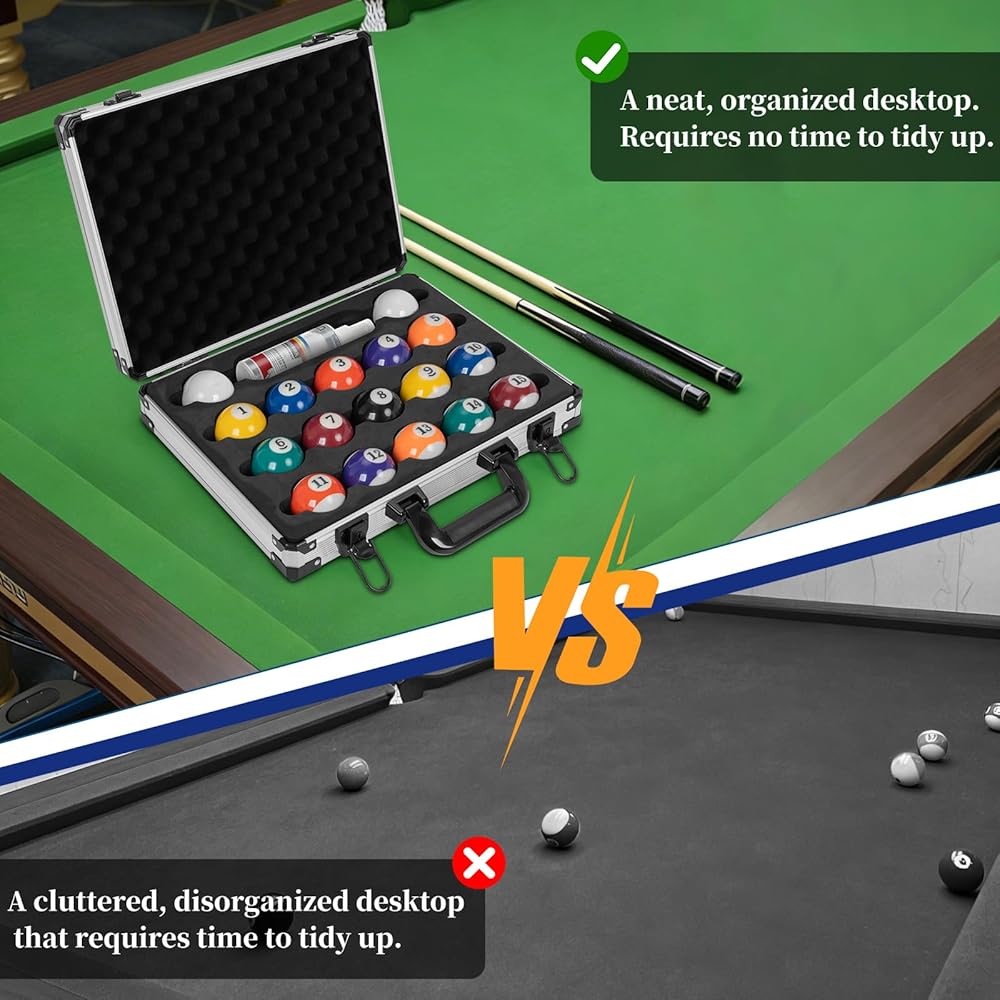 【Large Capacity】This billiard box can hold up to 17 2.25-inch diameter billiard balls, suitable for 8-ball and 9-ball, so there's no need to worry about placement. In addition, extra space is provided for cue cleaners or other small accessories.
