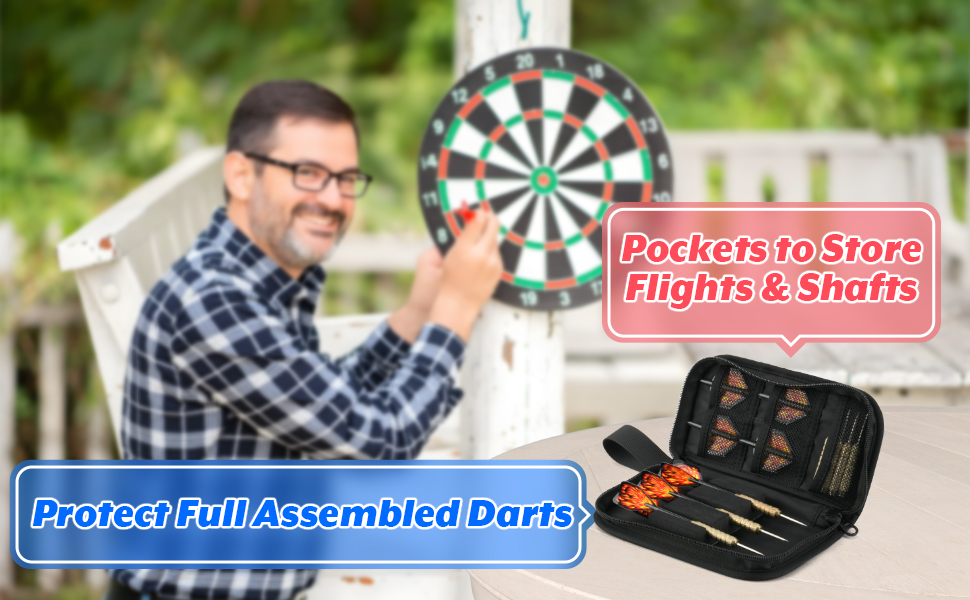 - حامل السهام: يحمل 3 سهام مجمعة بالكامل مع فتحات حمل صلبة من أسيتات إيثيلين-فاينيل (EVA)، وتمنع سحق الرحلات الجوية. جيوب شبكية إضافية مكونة من 7 جيوب لحفظ ملحقات لعبة رمي السهام.