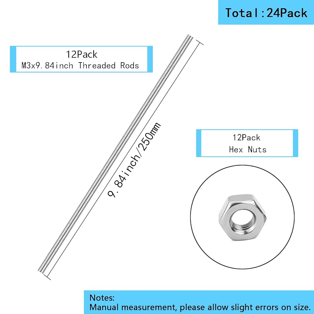 Package List:12Pcs M3×250mm Fully Threaded rods,12 Pcs M3 Stainless Steel Hex Nuts,A total of 24 pieces can be drilled, cut, heated and shaped.