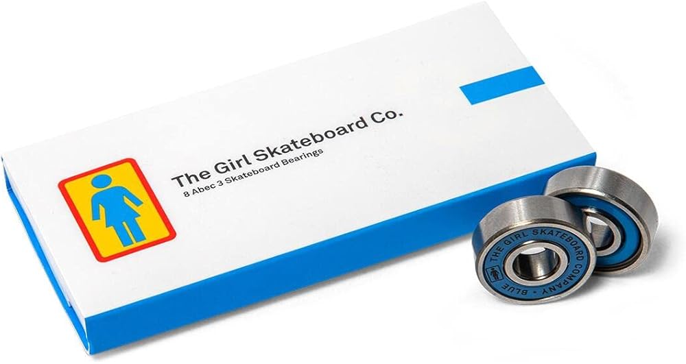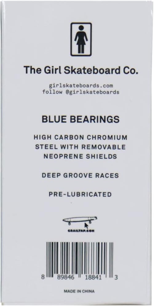 The Girl Skateboard Co. Blue Series Abec 3 Skateboard Bearings. High Carbon Chromium Steel Bearings with Removable Shields. Deep Groove Races. Pre-Lubricated.