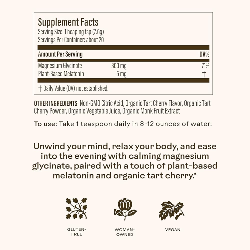 How to use: Stir 1 heaping teaspoon into 8–12 oz of water. Each serving contains 300mg magnesium glycinate + 0.5mg plant-based melatonin.