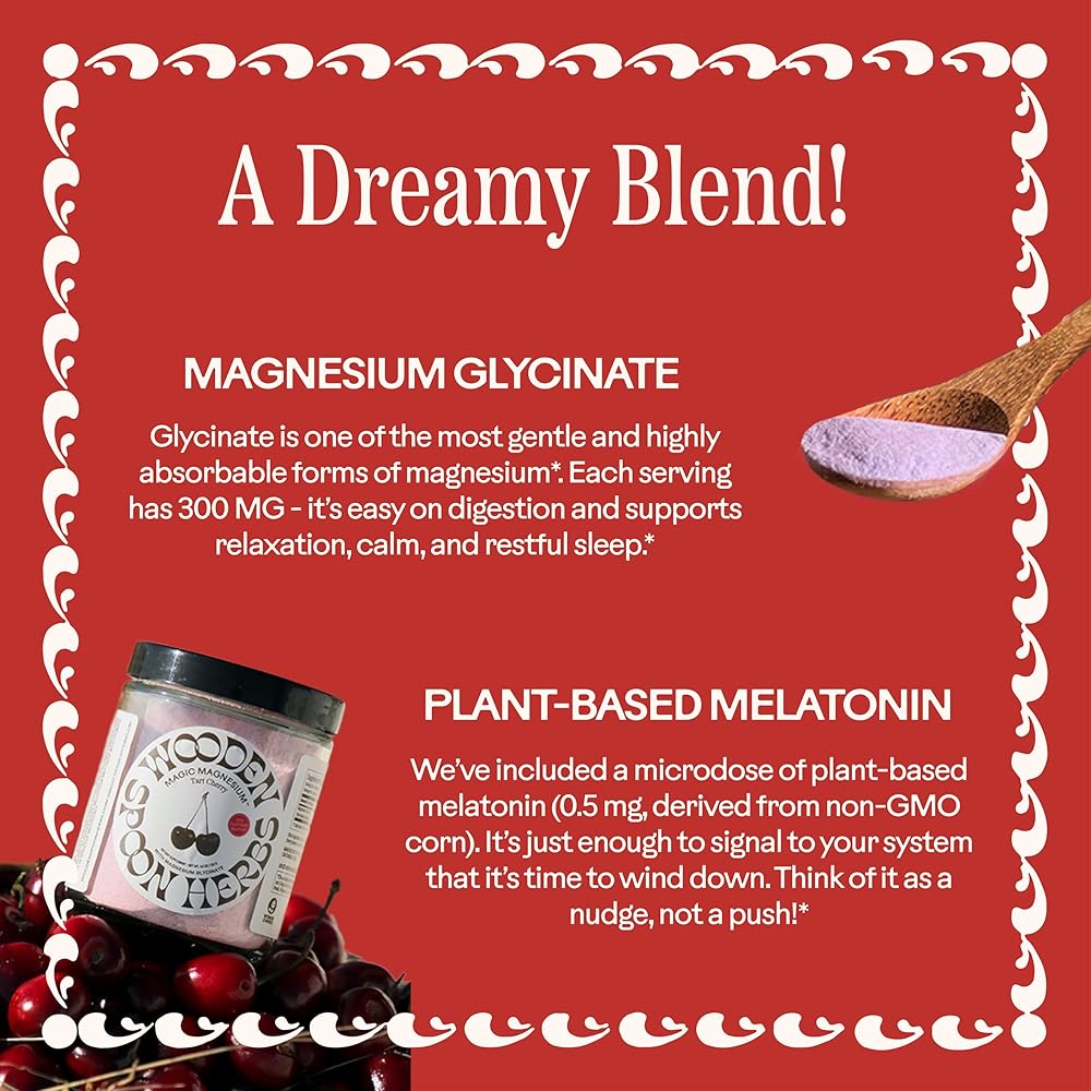 Magnesium does more than help you unwind—it's foundational support for your whole-body wellness. Wooden Spoon Herbs Magic Magnesium Tart Cherry is a calming nighttime drink mix crafted for your evening routine, combining gentle magnesium glycinate with a touch of plant-based melatonin and tart cherry to help you ease into rest.