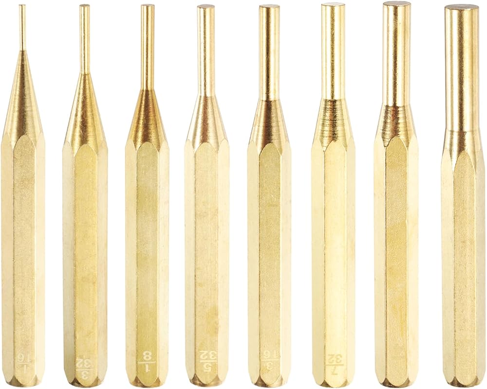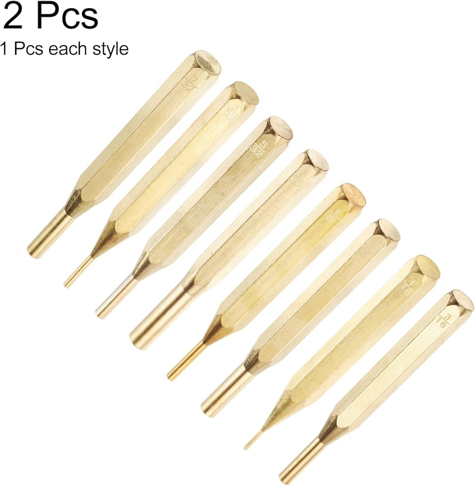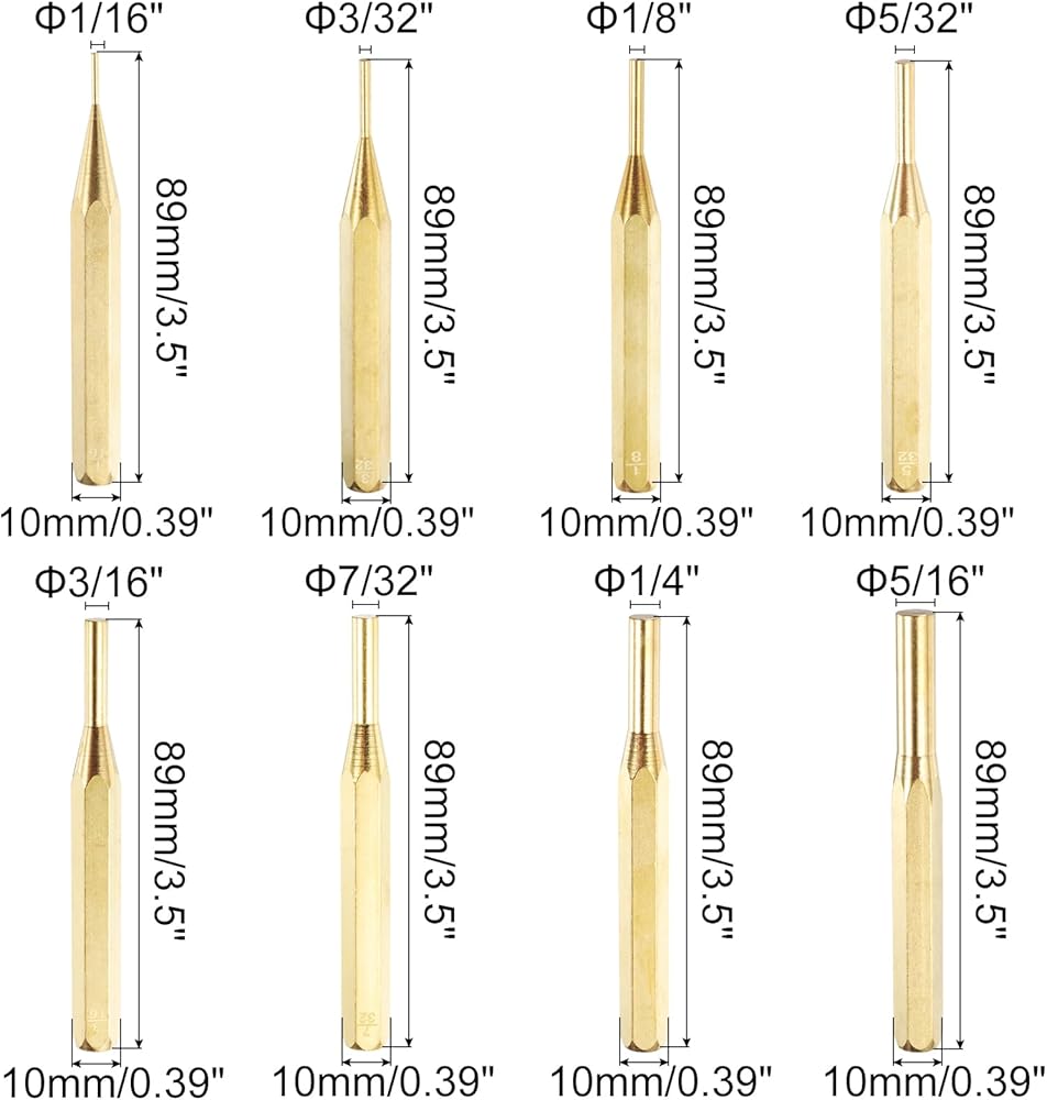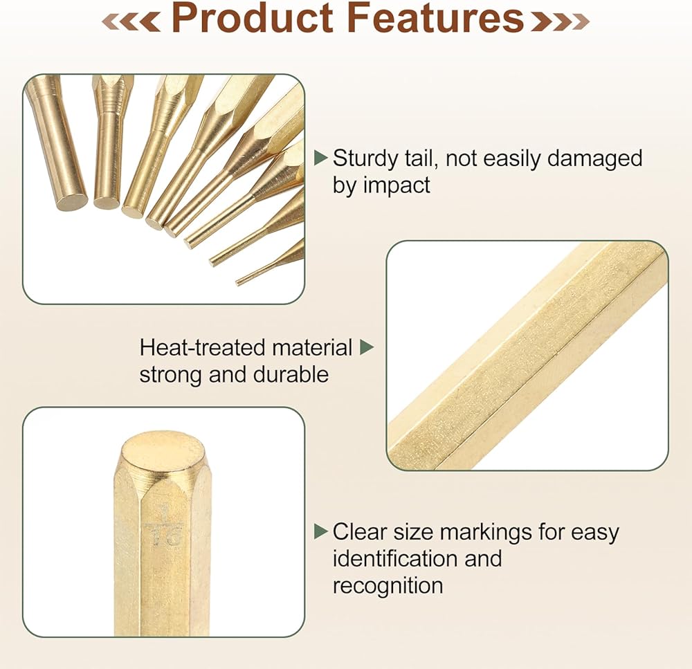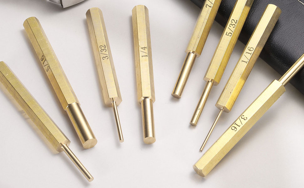 المادة - اللكمات الدبوسية مصنوعة من مادة النحاس وتمت معالجتها بالحرارة لضمان متانة ممتازة وقابلية تشغيل وأداء عام. تعتبر مجموعات الثقب النحاسية رائعة لإصلاح أو صيانة المعدات الصغيرة والآلات والمركبات، ويمكن استخدامها لقيادة الدبابيس والساعات والأساور وما إلى ذلك.