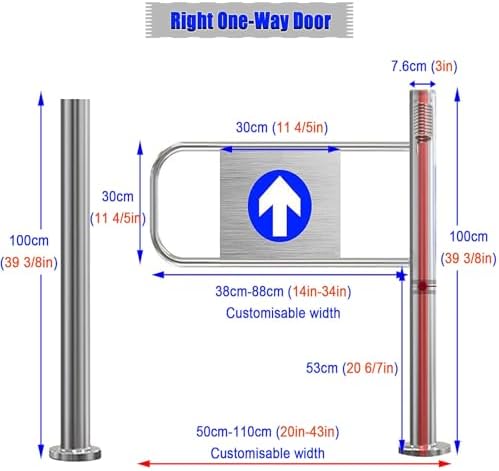 Our one-way opening door is expertly crafted to enhance crowd control and streamline pedestrian traffic flow, making it an ideal solution for high-traffic environments such as events, trade shows, and busy retail spaces. Constructed from premium stainless steel, this door is not only waterproof and wear-resistant but also designed for long-term durability and aesthetic appeal. Standing at 100 cm (39 inches) tall, the door features a customizable width adjustable between 38-88 cm (14-34 inches), allowing it to fit various locations seamlessly. Key benefits include effective access control to manage foot traffic, an automatic closure mechanism for user convenience, and a robust design reinforced with expansion screws for secure installation. Its compact design ensures it occupies minimal space while maximizing functionality. Included in the package is one one-way pedestrian passage door, ready for quick and easy setup. Please note that this door serves as a guidance tool for entrances and is not intended as a security barrier. Its thoughtful design makes it an invaluable asset for improving crowd management in any bustling setting, ensuring a smooth flow of people and enhancing the overall experience for visitors.