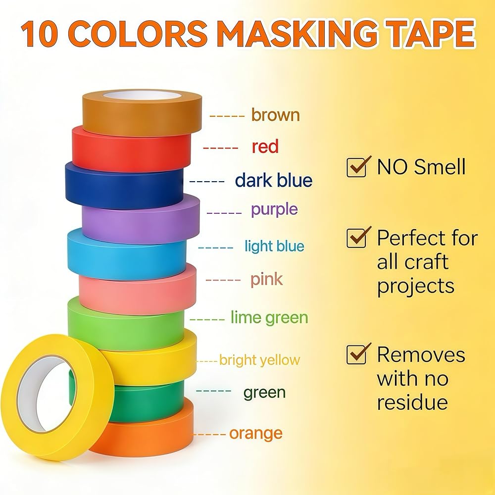 • Value Package: Receive 10 vibrant tapes in a variety of colors, including red, yellow, purple, orange, green, Light green,Sky blue,brown,pink, and blue. These tapes boast rich and vivid hues, making them the ideal craft tape you've been seeking! Each tape roll is 22 Yards Long With 1 Inch Thickness