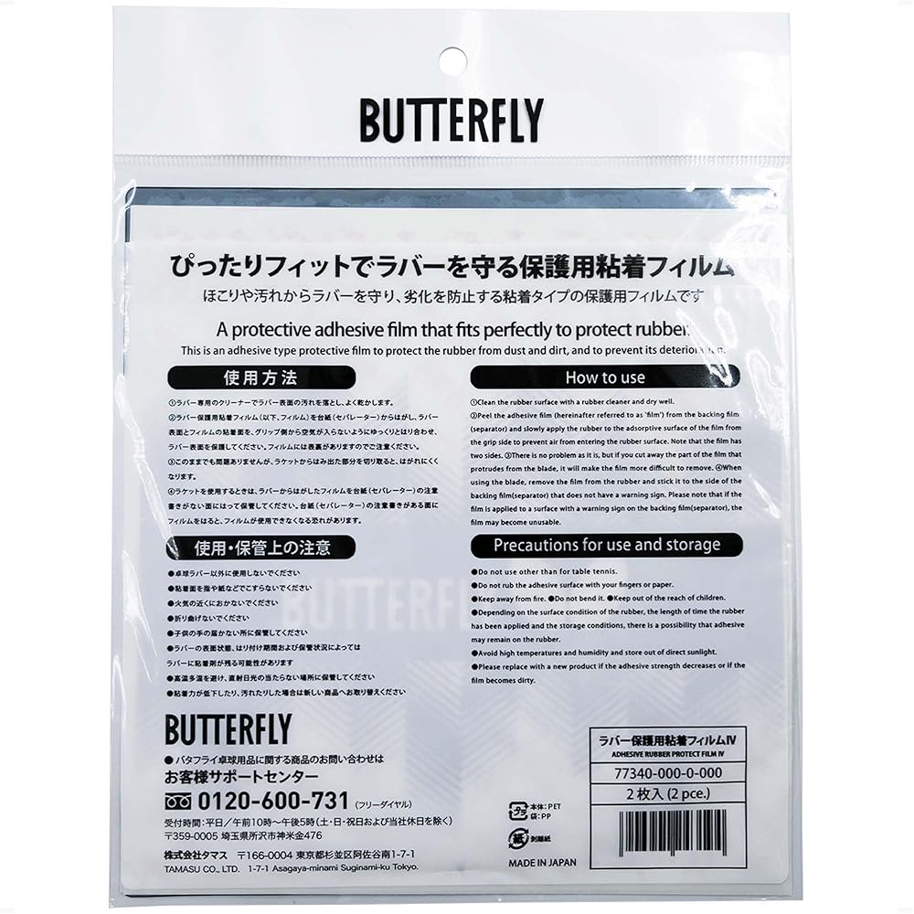 To further prolong the life of your paddle, add a protective film to the rubber and store your paddle in a racket case. Each package contains two sheets of protective film. About Butterfly - Hikosuke Tamasu founded Tamasu Co., Ltd. in the small town of Yanai City, Japan in 1950. This was the beginning of a company career which is almost unique in table tennis. A renowned international for Japan, Tamasu fulfilled his dream of a lifetime when he made his hobby his profession. At that time, he could hardly imagine that he would make Butterfly the leading brand worldwide. Creativity, durability, and a profound technical knowledge meant success. 0ver and over again he looked for new possibilities in order to optimize techniques by innovative playing material. Tamasu realized that each player is different and has strengths and weaknesses. By offering individual playing material Tamasu wanted to help players right from the beginning to emphasize their individuality. Since 1983 Butterfly has its own training and research center in Tokyo. Highly qualified scientists co-operate with world class players and coaches for the development of rubber and blade technology. Butterfly's rubbers and blades are used by more than half of the participants at World and European Championships.