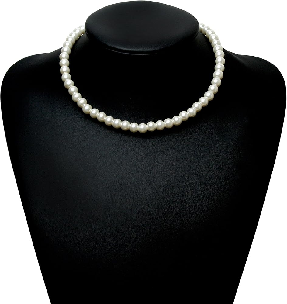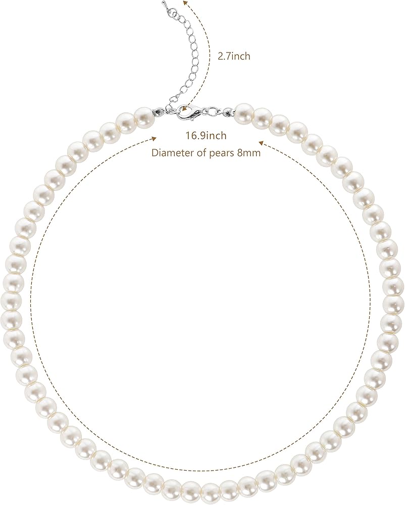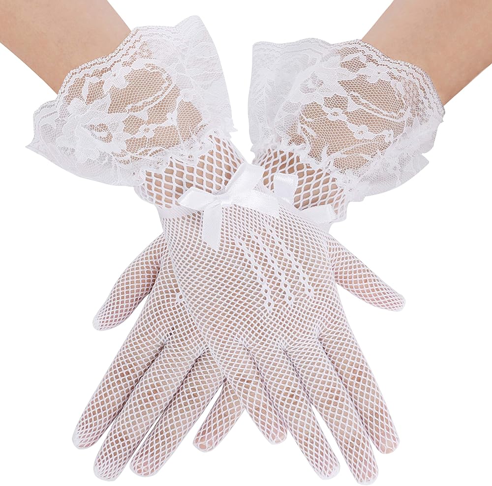 The fascinator hat is actually 3 pieces, the fascinator and hair clip are detachable from the headband; Lace gloves are stretchy with fishnet design; Pearl necklace is 16” in length and adjustable with 2.7" extension chain on back.