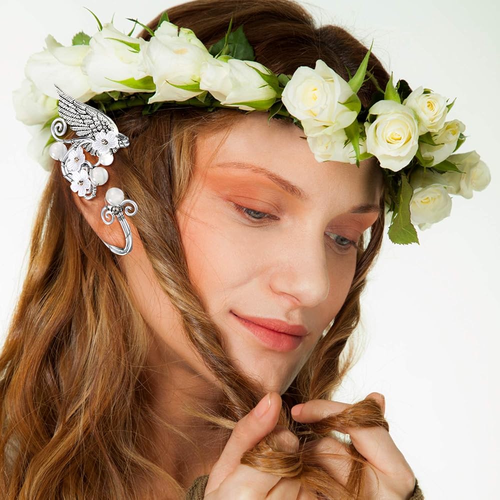 زوجان من أقراط الأذن الأنيقة بتصميم جناح اللؤلؤ مصنوعة يدويًا للحفلات التنكرية وحفلات الهالوين التنكرية وحفلات الزفاف