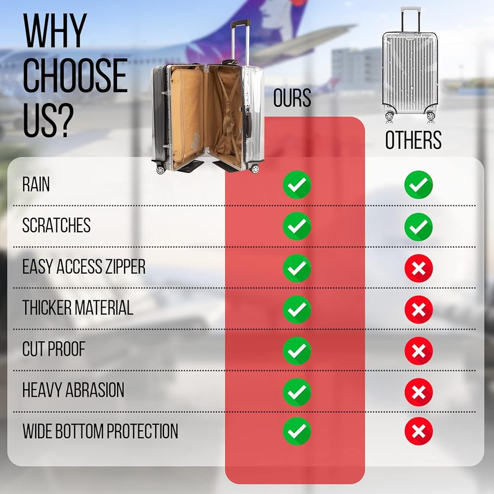 • يحمي أمتعتك من الخدوش والأضرار أثناء النقل في المطار، وعربة الأمتعة، وحمولة الطائرة. يحمي أيضًا من سوء التعامل مع أمتعة موظفي المطار.