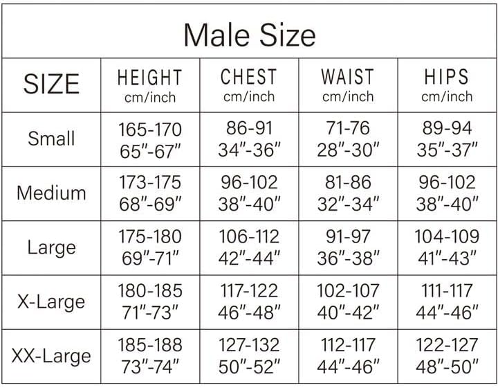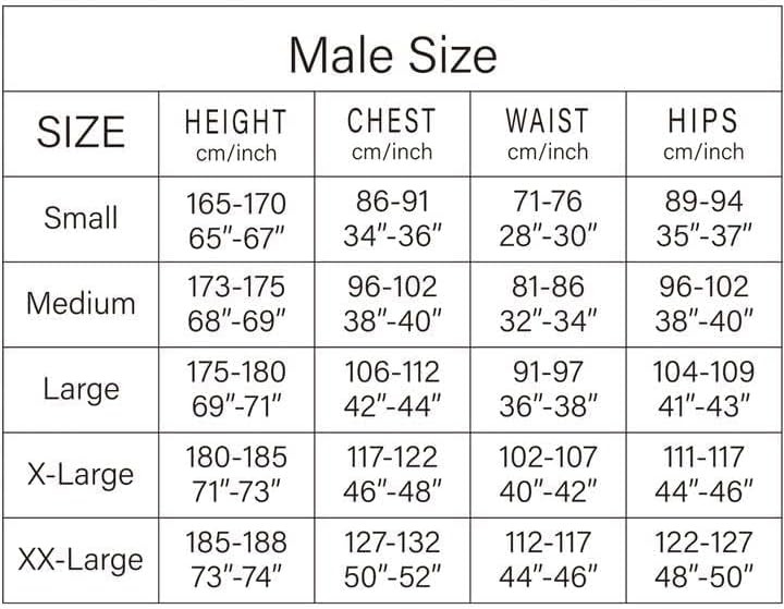 XL:Height71-73"Chest46-48"Waist40-42"Hips44-46"
