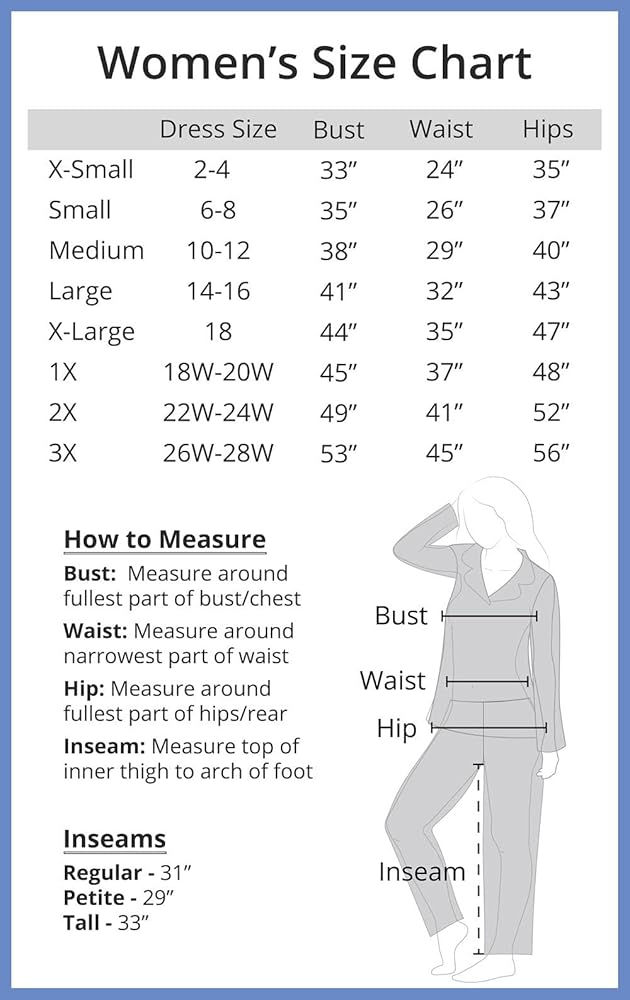 اعثري على المقاس المثالي - تم تصميم البيجامات النسائية لدينا على يد خبراء ملابس النوم لتناسب مجموعة واسعة من الأجسام؛ ستجد أدناه مخططًا للحجم لمساعدتك في العثور على مقاسك المثالي.