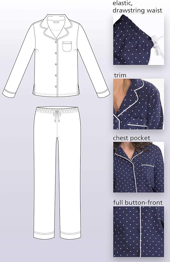 طقم متطابق مكون من قطعتين - أكمام طويلة، زر أمامي وبنطال كامل الطول، مريح؛ استمتعي بالنوم في طقم البيجامة النسائي المتطابق المكون من قطعتين والمصمم بشكل كلاسيكي والذي يتميز بياقة مدببة وجيب على الصدر وحواف أنيقة على الحواف وخصر مطاطي برباط؛ متوفر في المواد الصلبة الغنية الحصرية ونقاط البولكا المرحة.