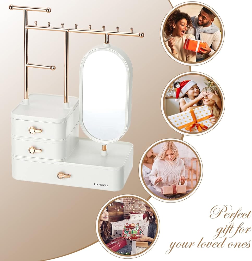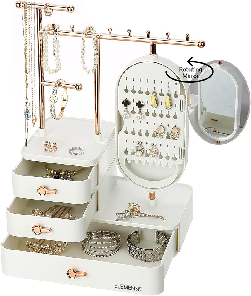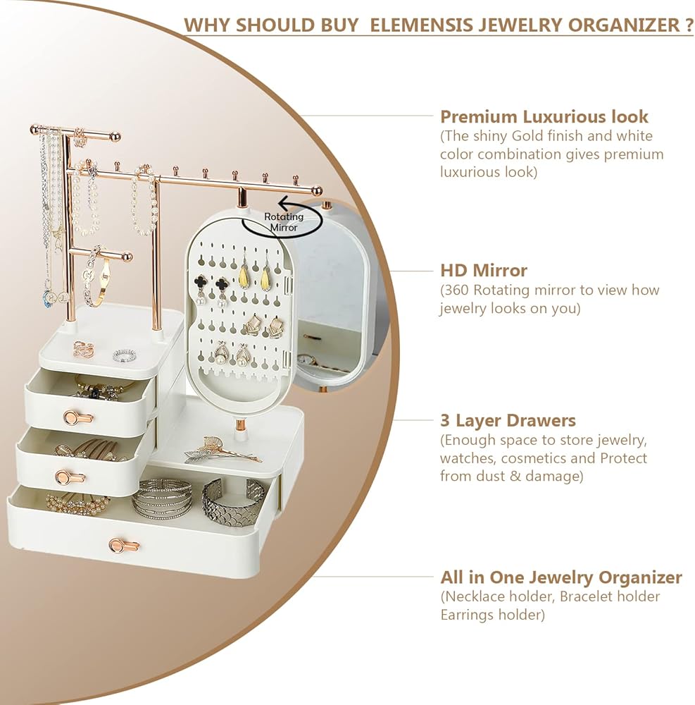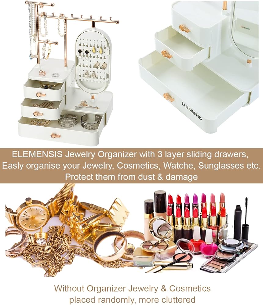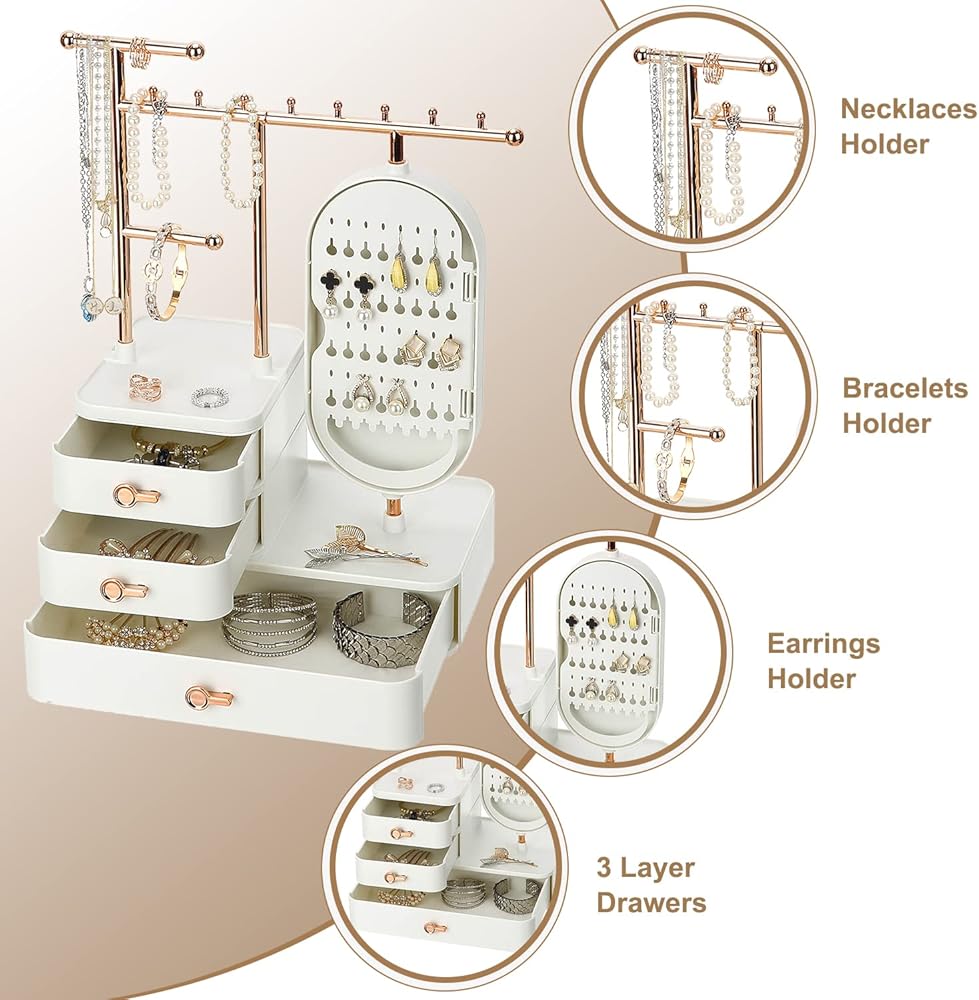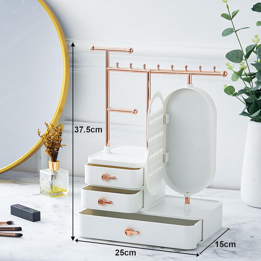 Introduce this luxurious and modern jewelry organizer to your desktop, which could improve your room decor. With large capacity, a total of three layers drawer, can place all kinds of jewelry and cosmetics. Comprised of upper rods, 3 drawers and a mirror, this jewelry storage box knows exactly the way you like it. The mirror opens to showcase a hidden earring holder, so you can keep your jewellery tidy easily, no need to worry about the necklace entwined, the rings and earrings leave around. Perfect for store your rings, earrings, necklace, bracelets, watch and hair clip, reasonable functional partition make all the jewellery is neat.