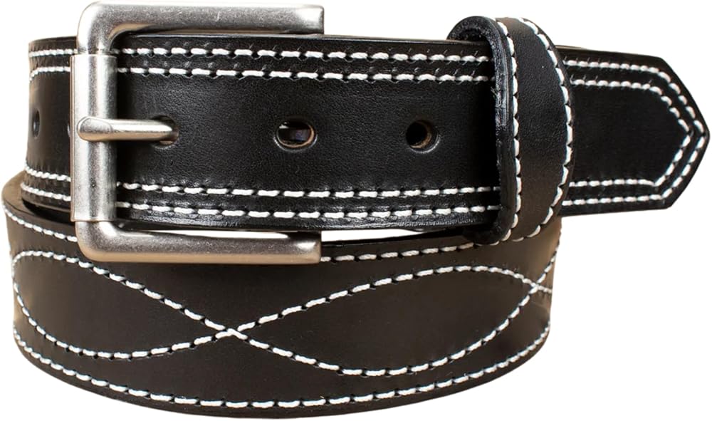 هذا الحزام المصنوع يدويًا مصنوع من قطعة صلبة بوزن 14oz (سمك 7/32 بوصة - 1/4 بوصة) من الجلد مع نمط خياطة مزخرف على شكل 8 على السطح للحصول على مظهر غربي.