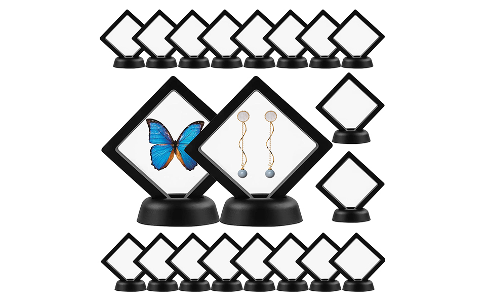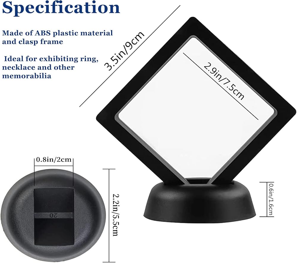 • Set of 20: Each square 3D floating frame measures approx 2.7x2.7x0.8 inch supported by 2.2 inch base and the display screen is 2.2x2.2 inches. You will get 20pieces display screen and 20 pieces stand.
